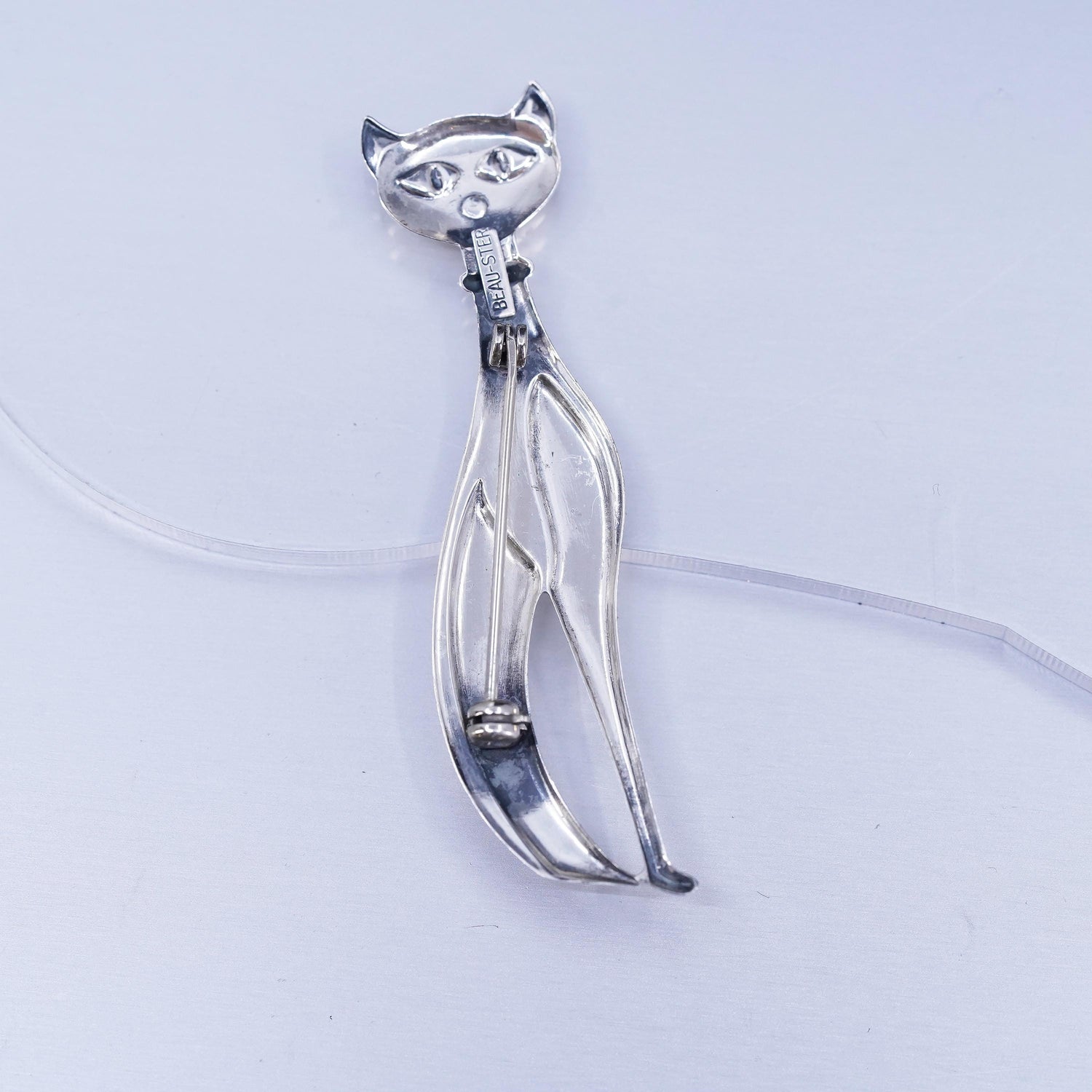 Vintage Beau sterling silver handmade brooch, 925 kitty cat pin, stamped Sterling Beau