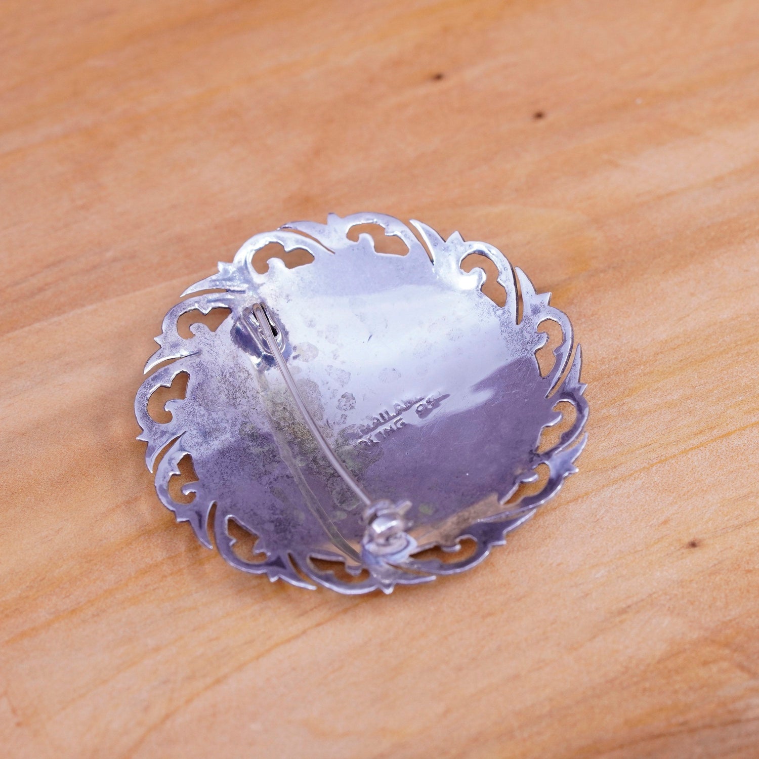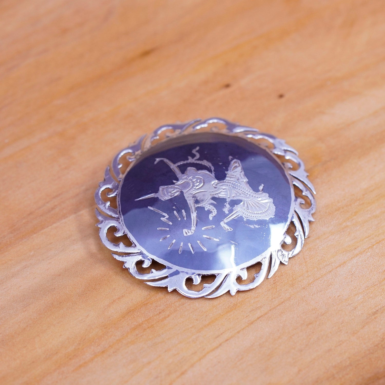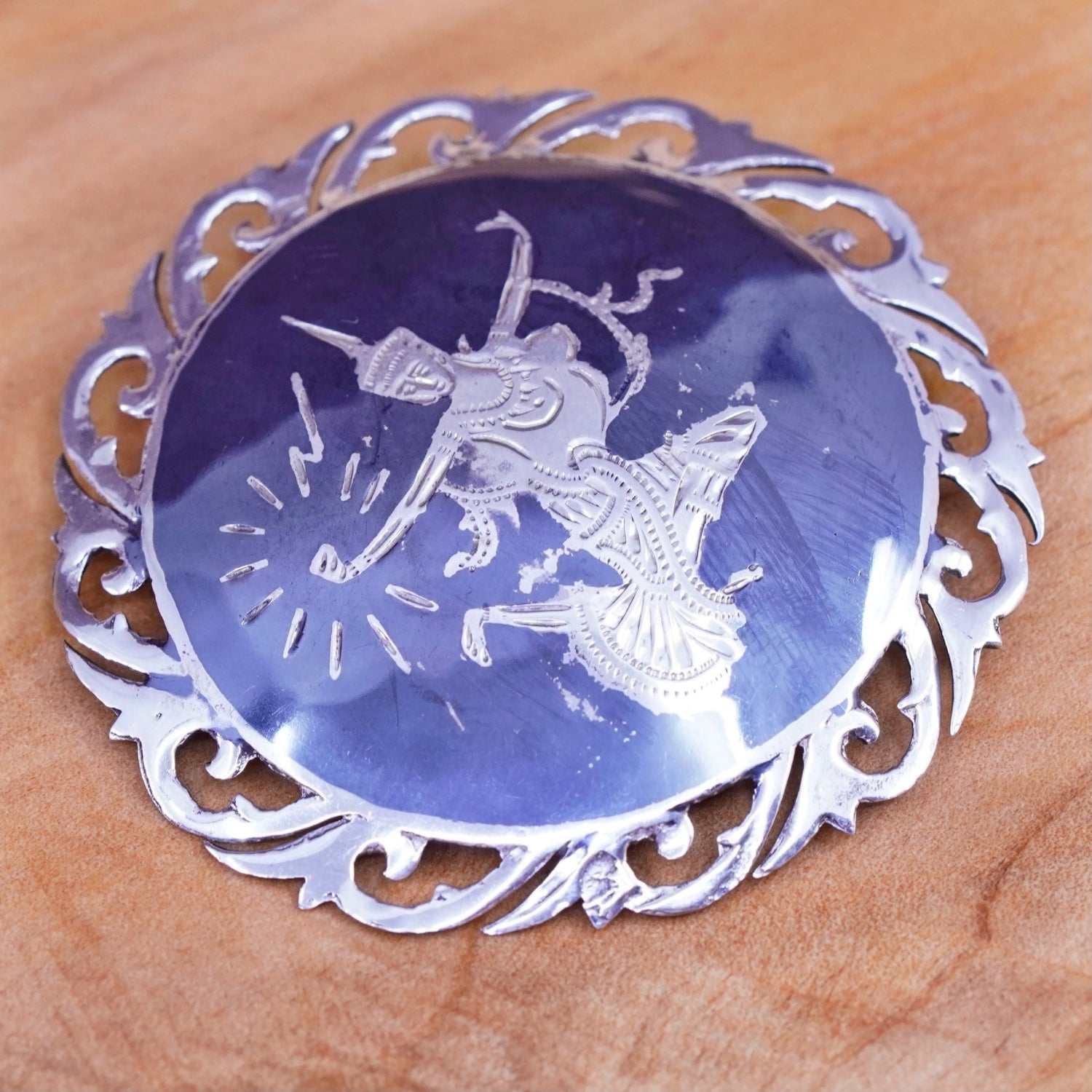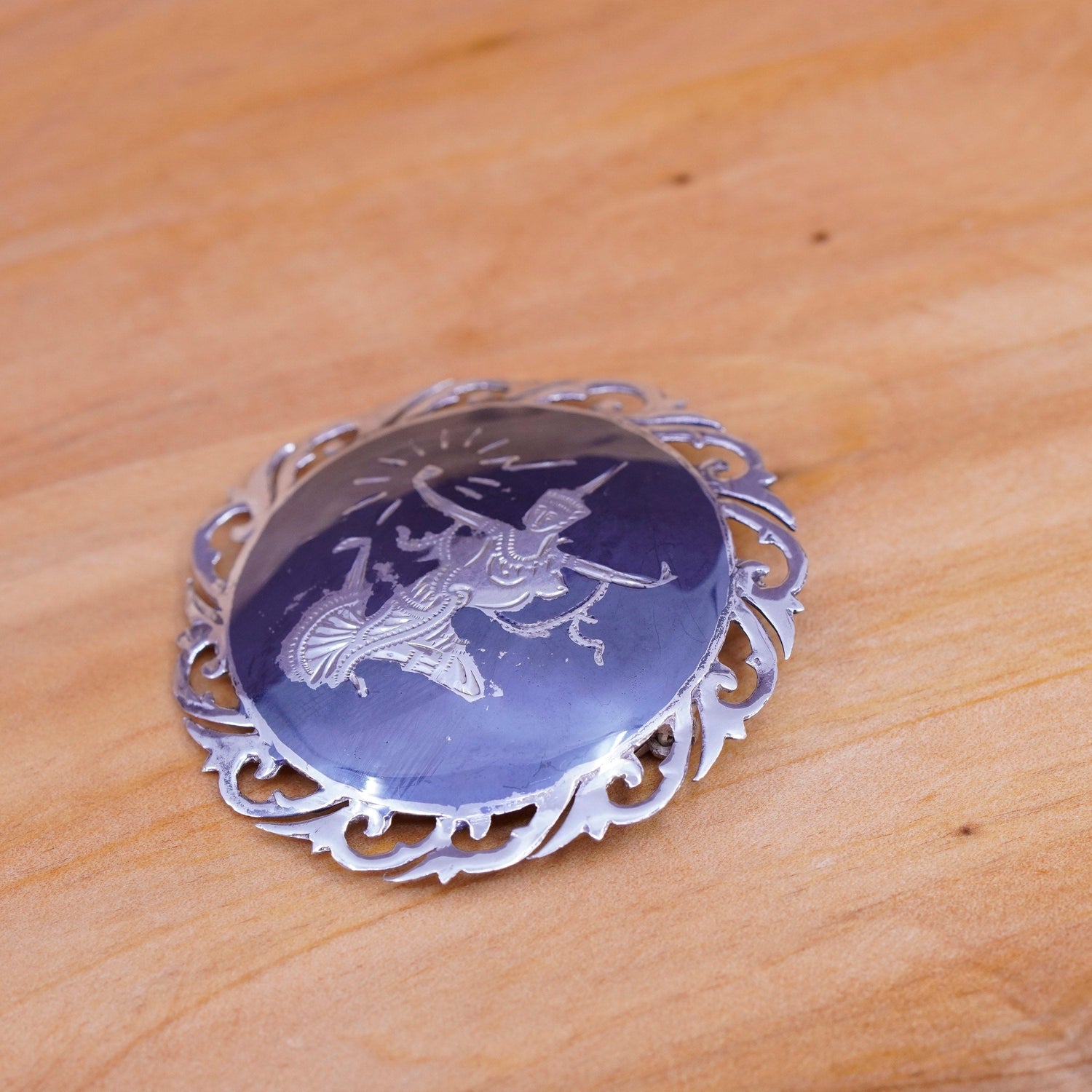 Vintage Indian SIAM handmade oxidized sterling 925 silver brooch with goddess embossed. stamped 925 Siam