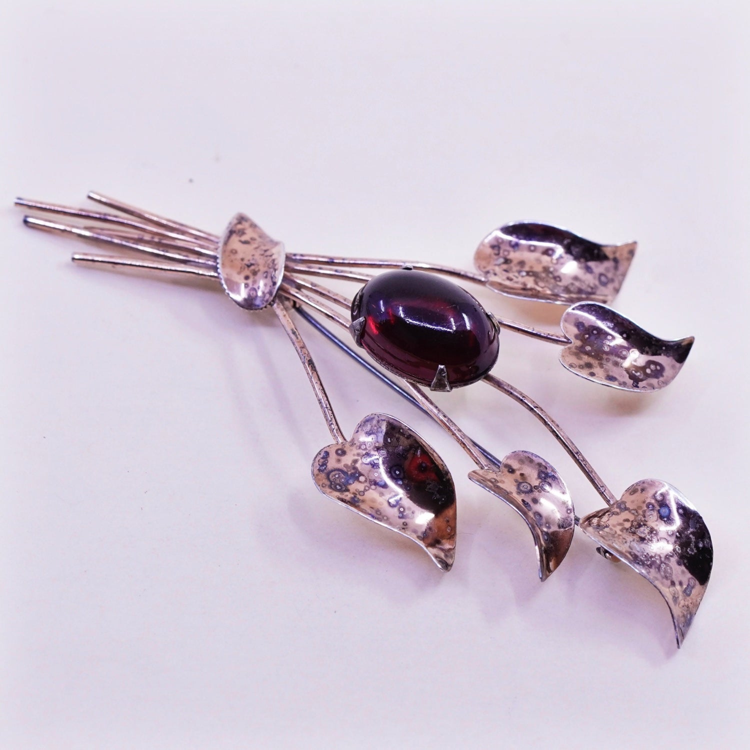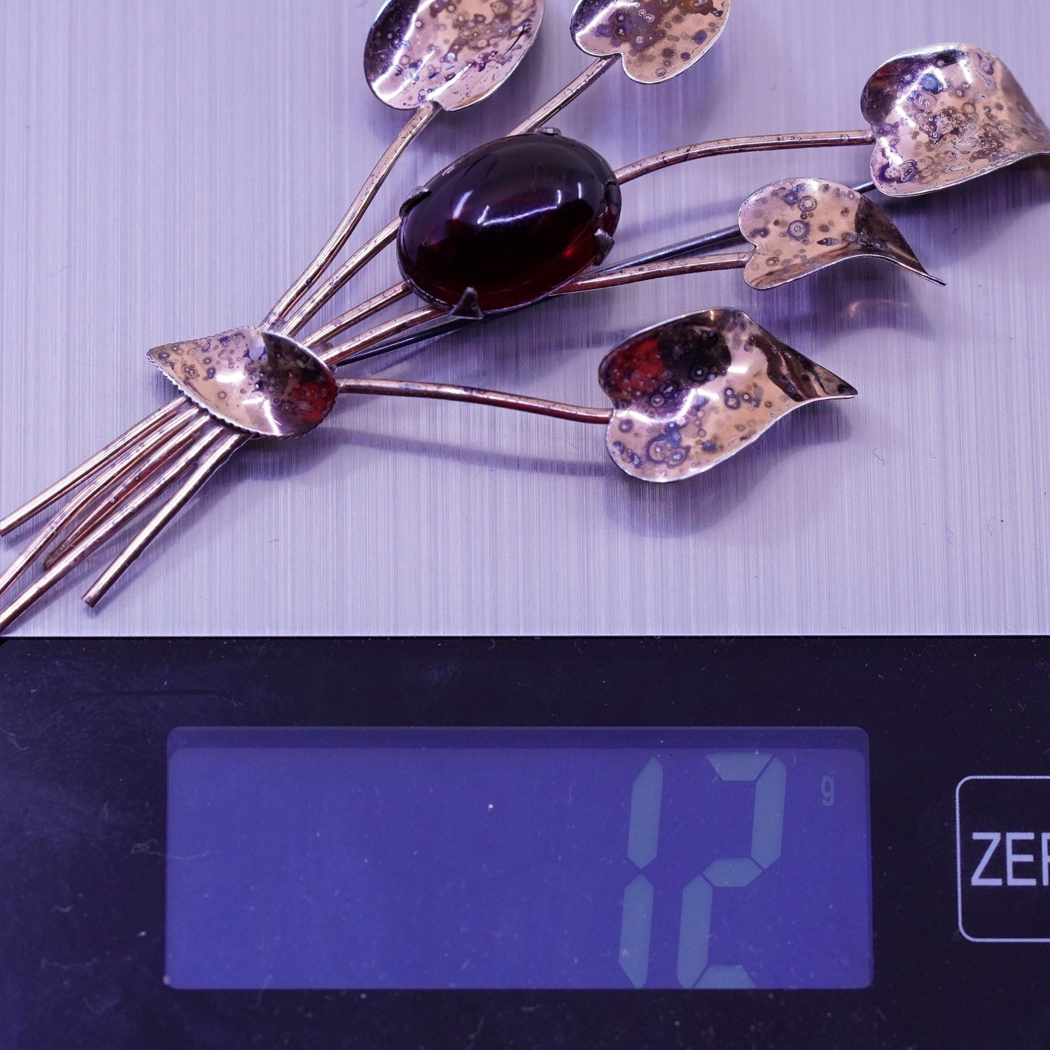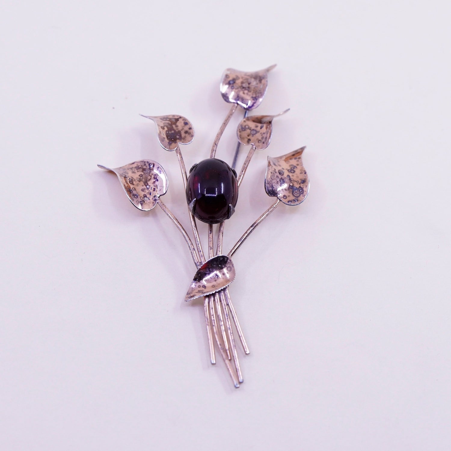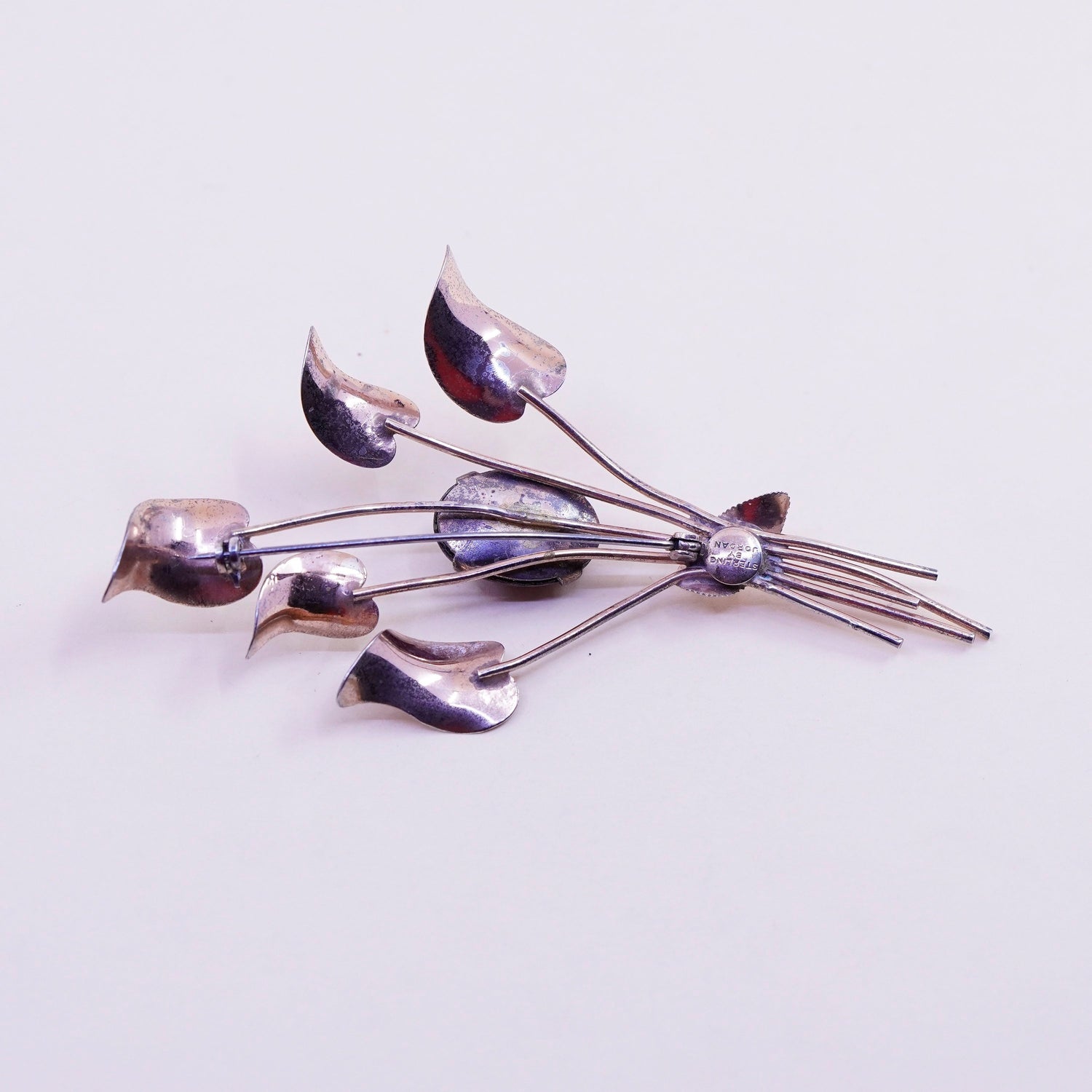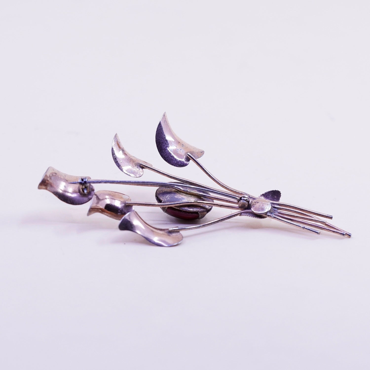 Vintage Jordan Vermeil gold over sterling silver brooch, 925 flower with garnet, stamped Sterling Jordan, the stain cannot be removed
