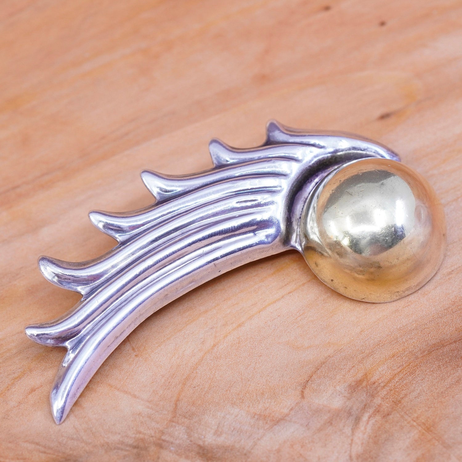 Vintage Mexico two tone sterling 925 silver handmade wing brooch with brass bead, stamped Mexico 925 TC-87