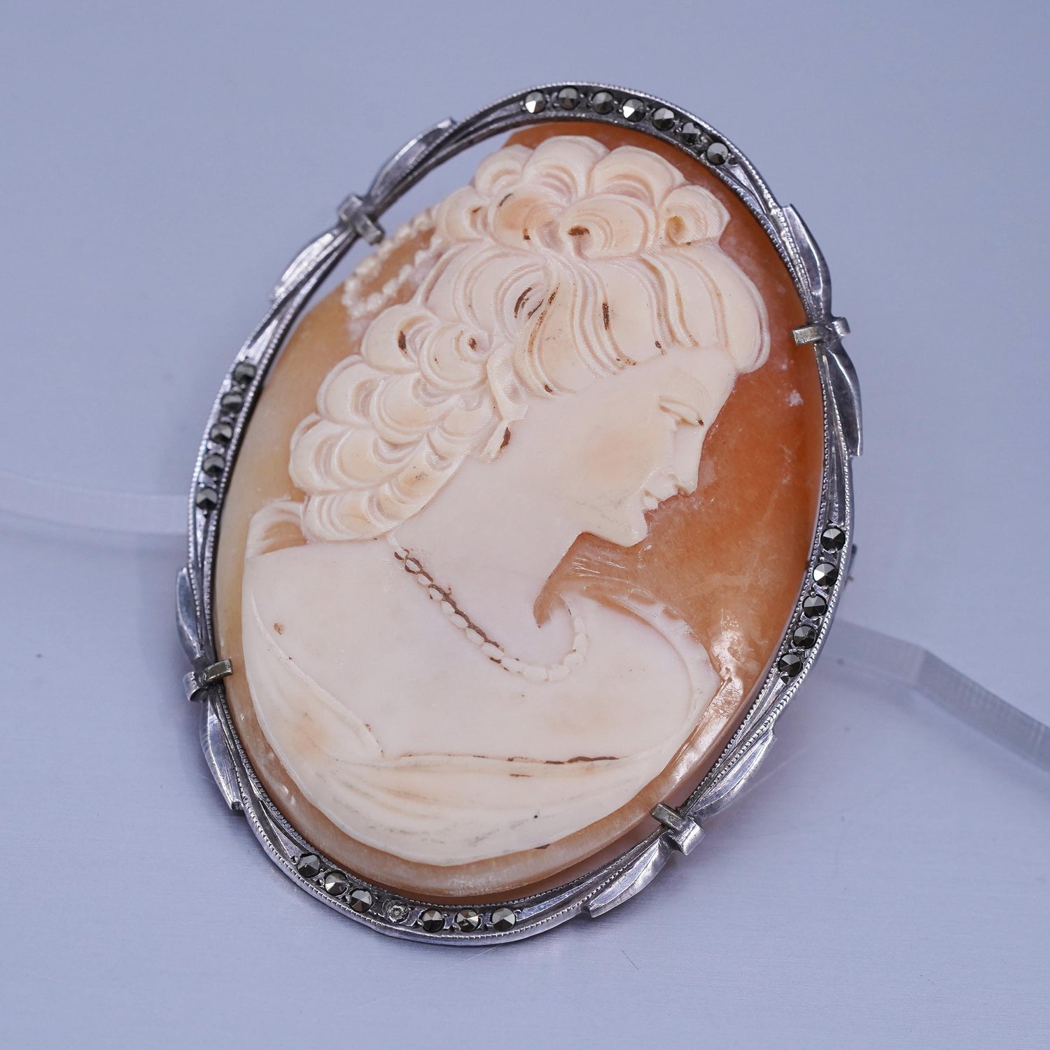 Vintage Sterling 925 silver handmade brooch pendant with agate carved cameo girl, stamped 925, the stone is chipped