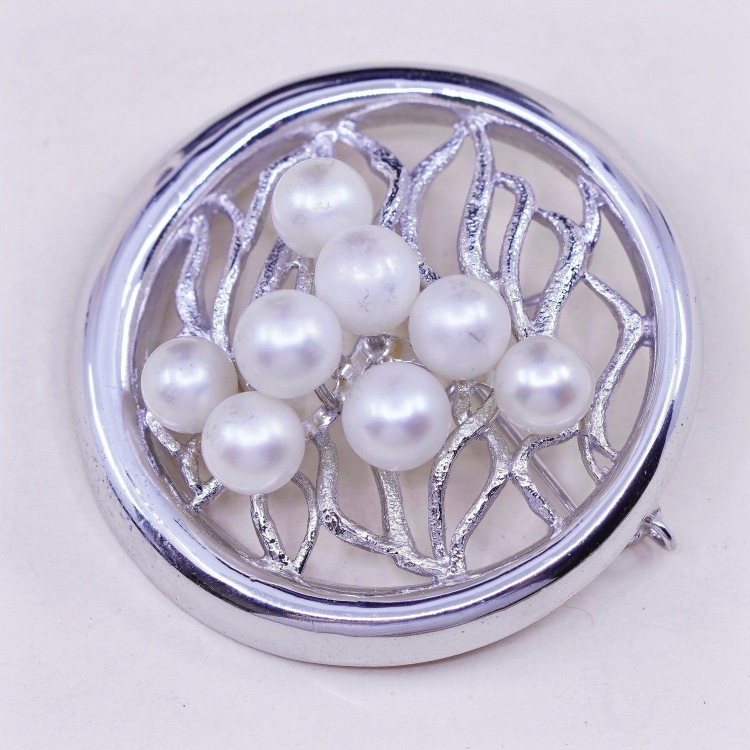 Vintage Sterling 925 silver handmade circle brooch pendant with cluster pearl, simple, elegant, Stamped silver