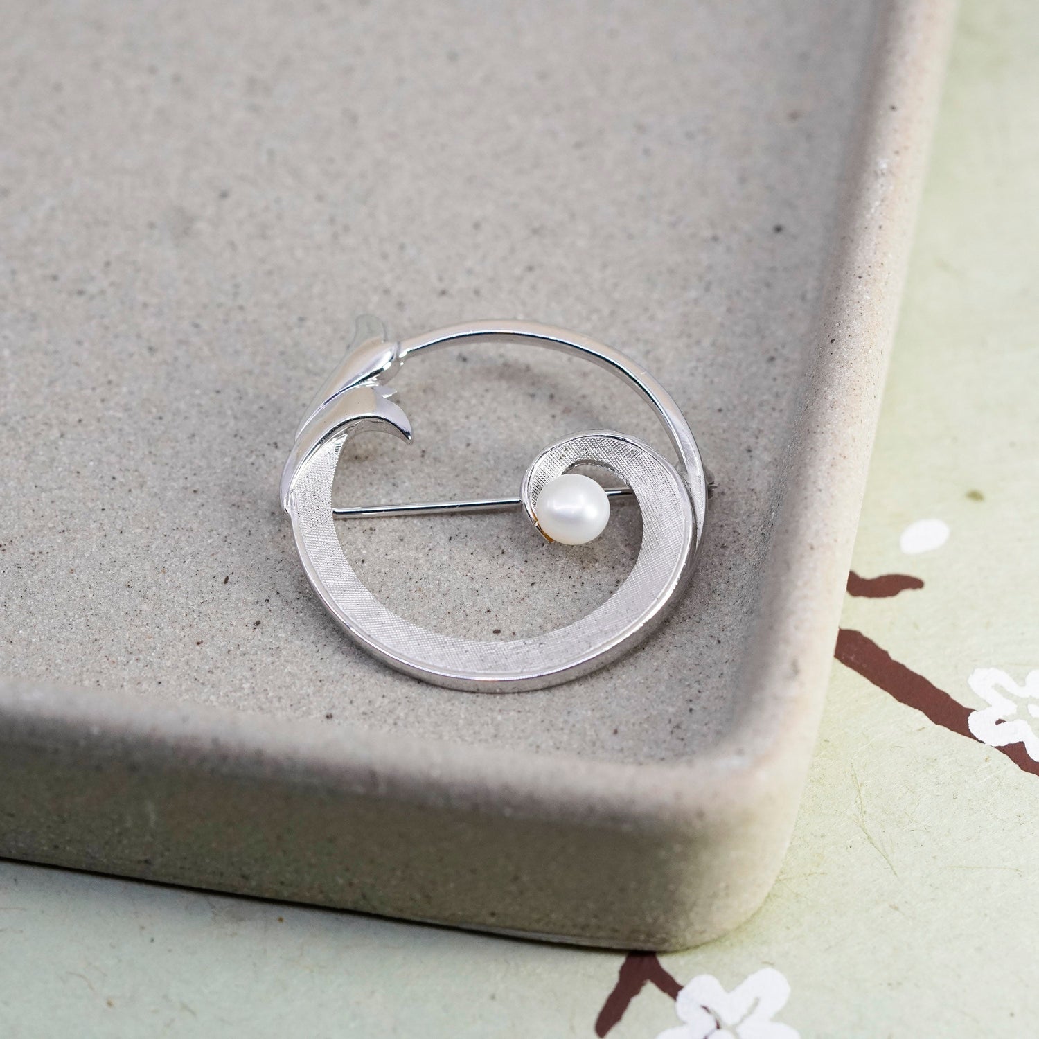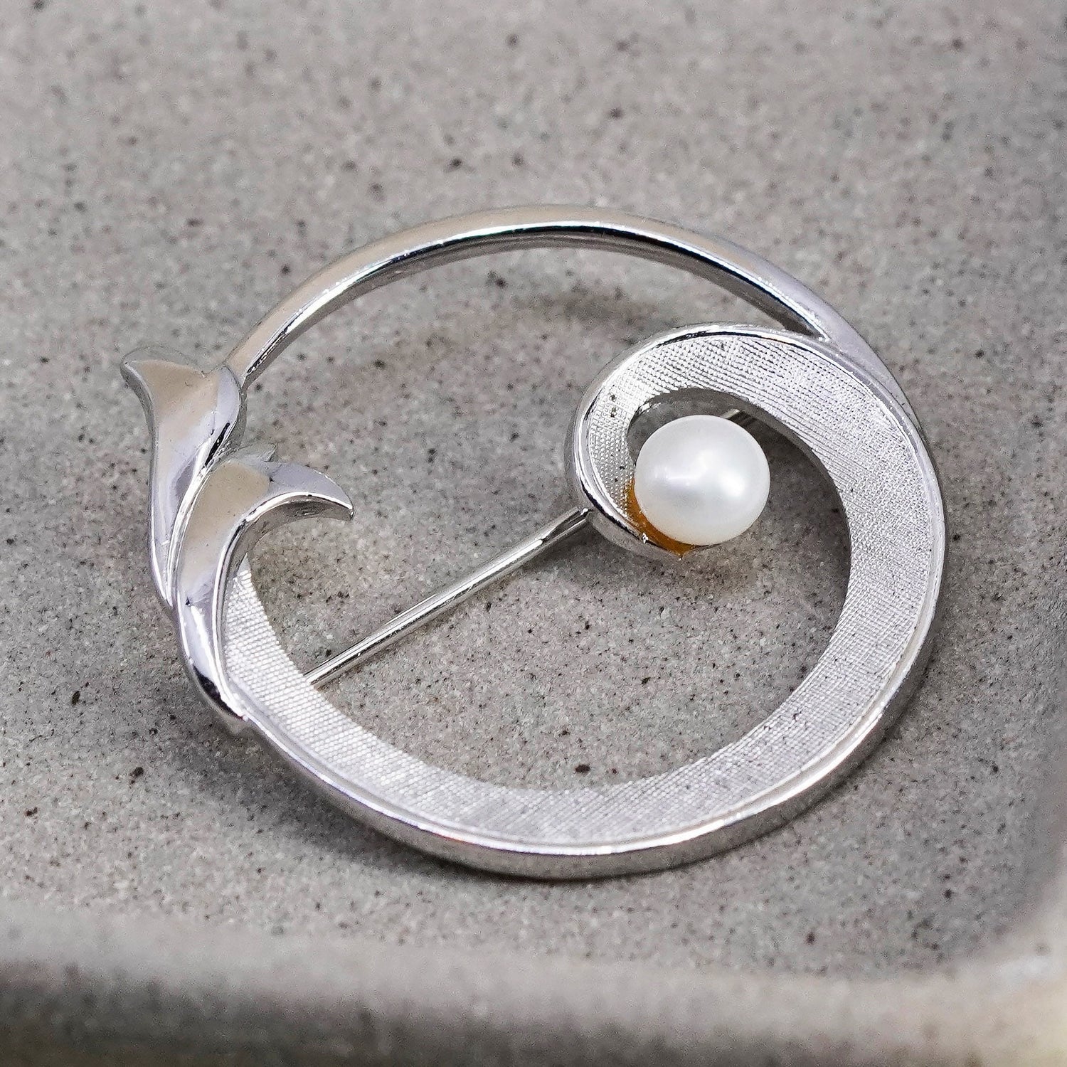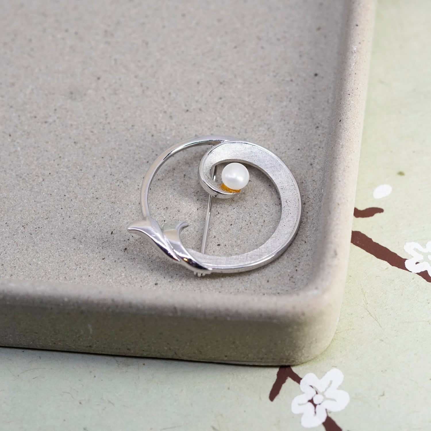 Vintage Sterling 925 silver handmade circle brooch pendant with pearl, elegant