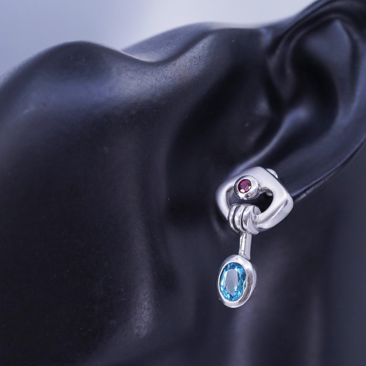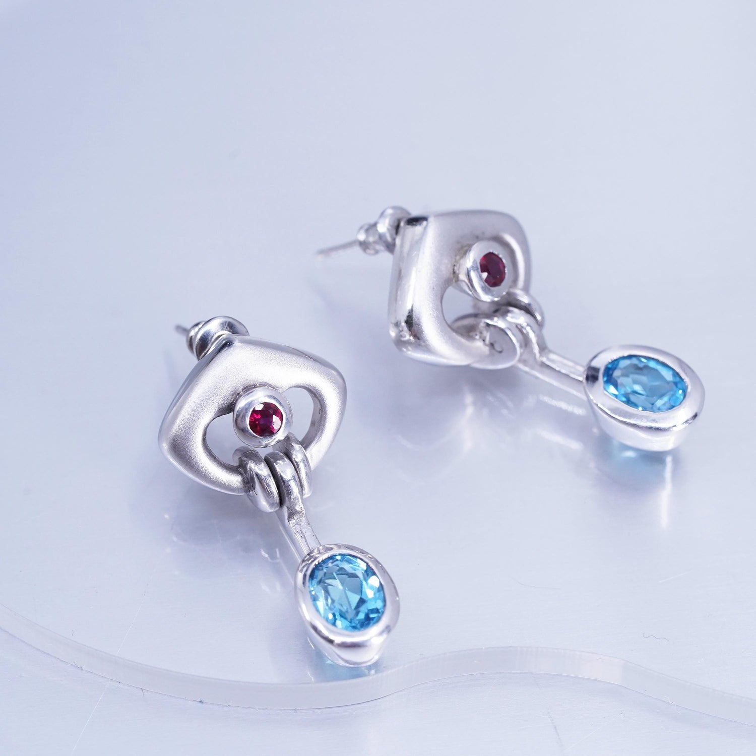 Vintage Sterling 925 silver handmade earrings with blue topaz and ruby, stamped 925