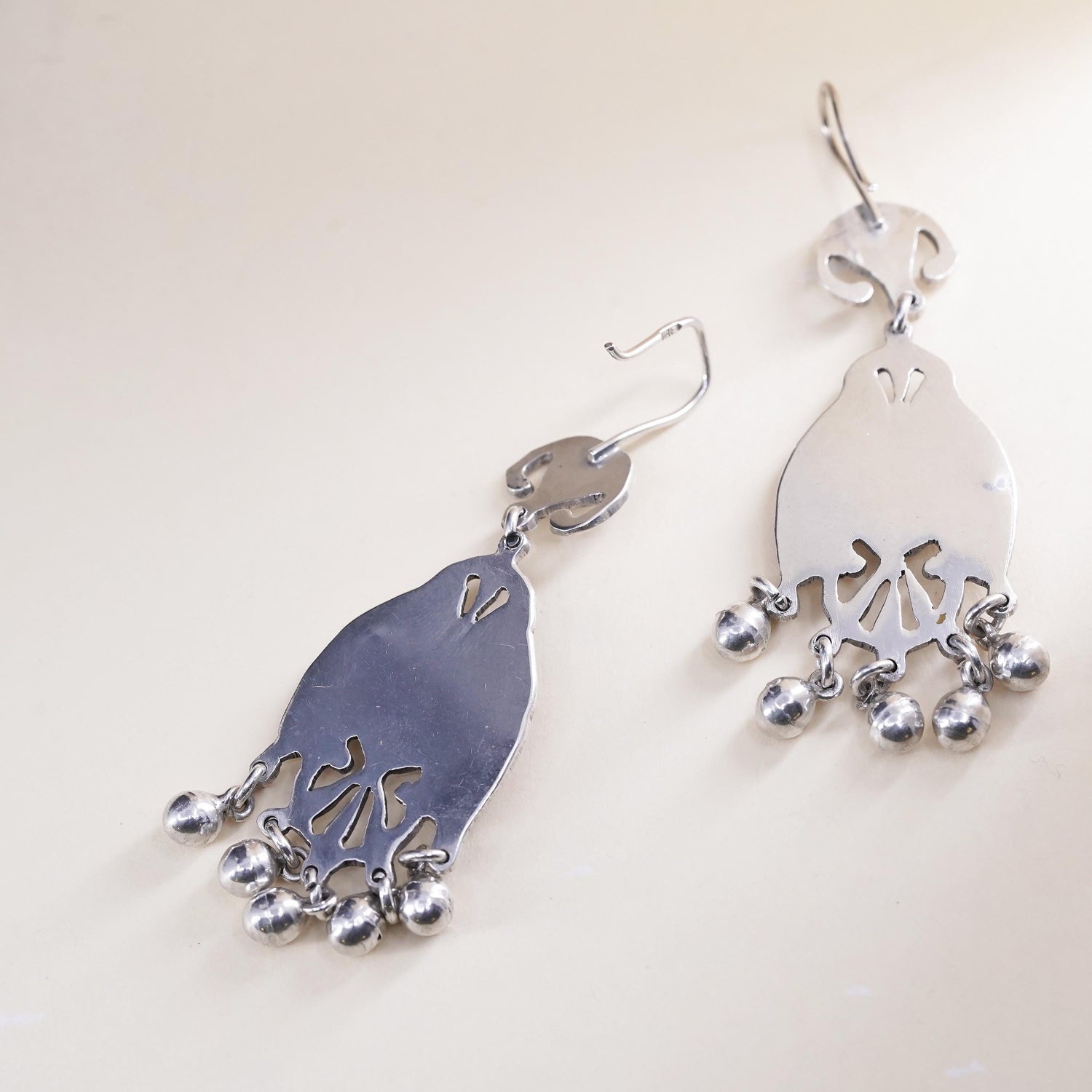 Vintage sterling 925 silver handmade earrings with onyx and bead dangles, stamped 925 on the hooks