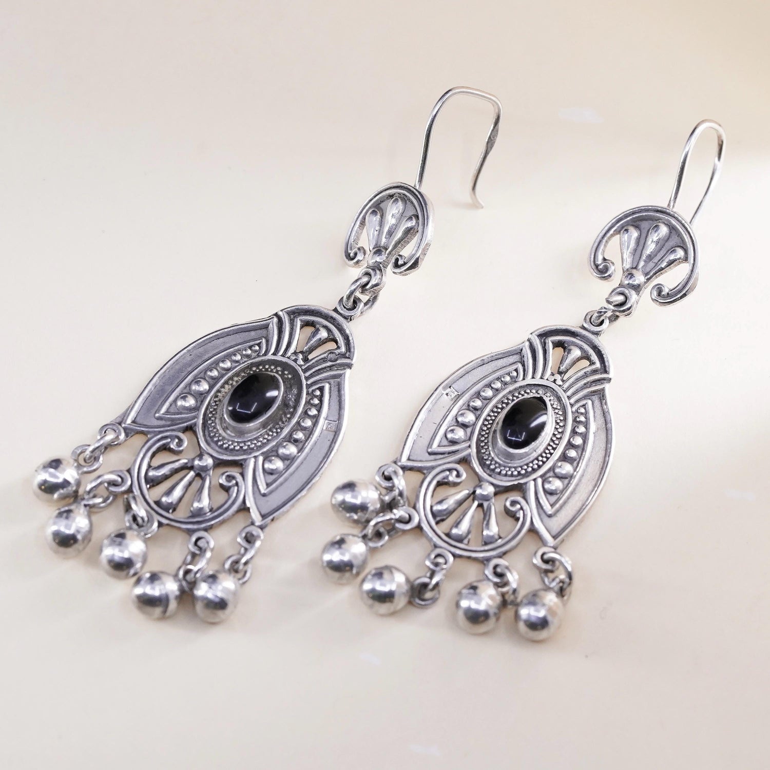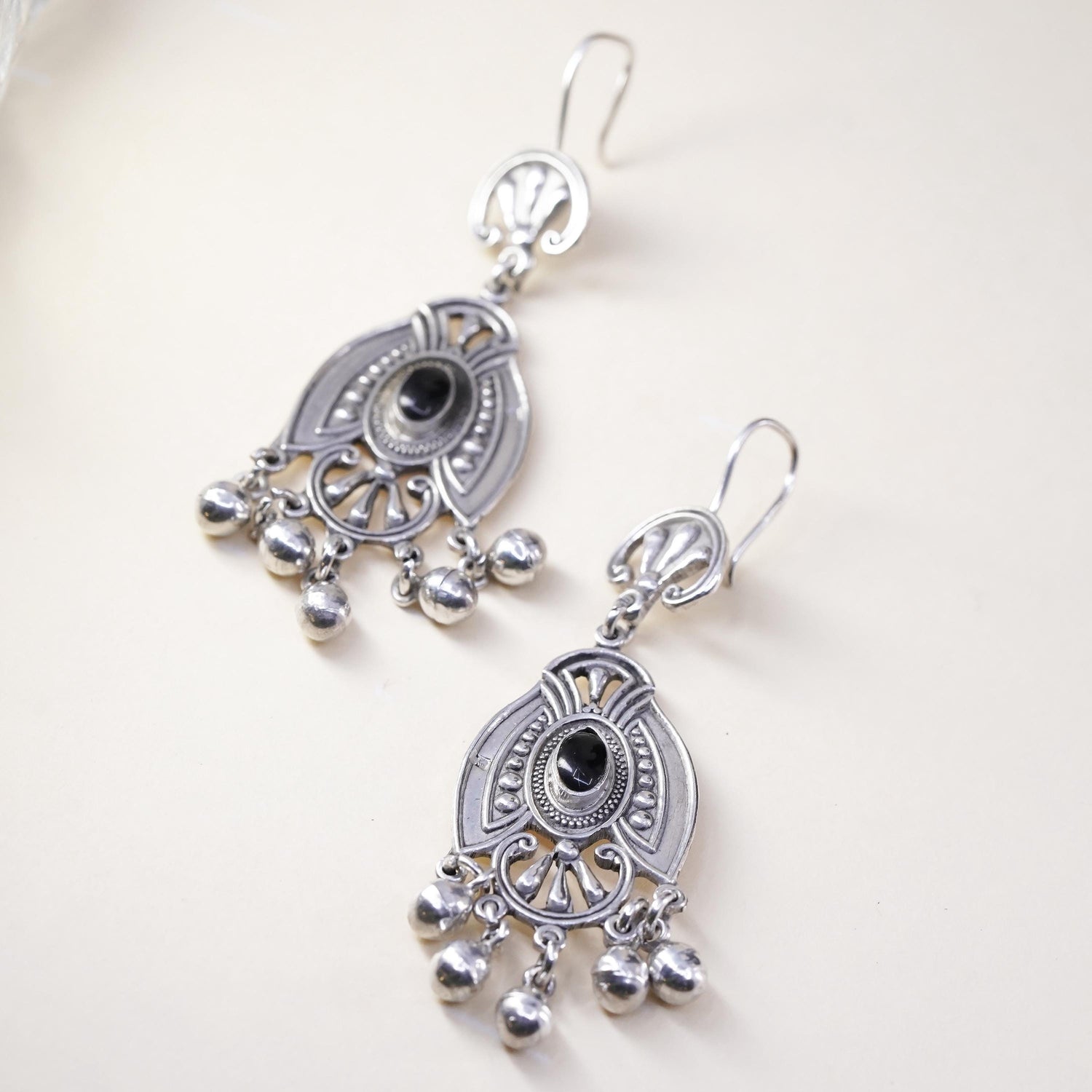 Vintage sterling 925 silver handmade earrings with onyx and bead dangles