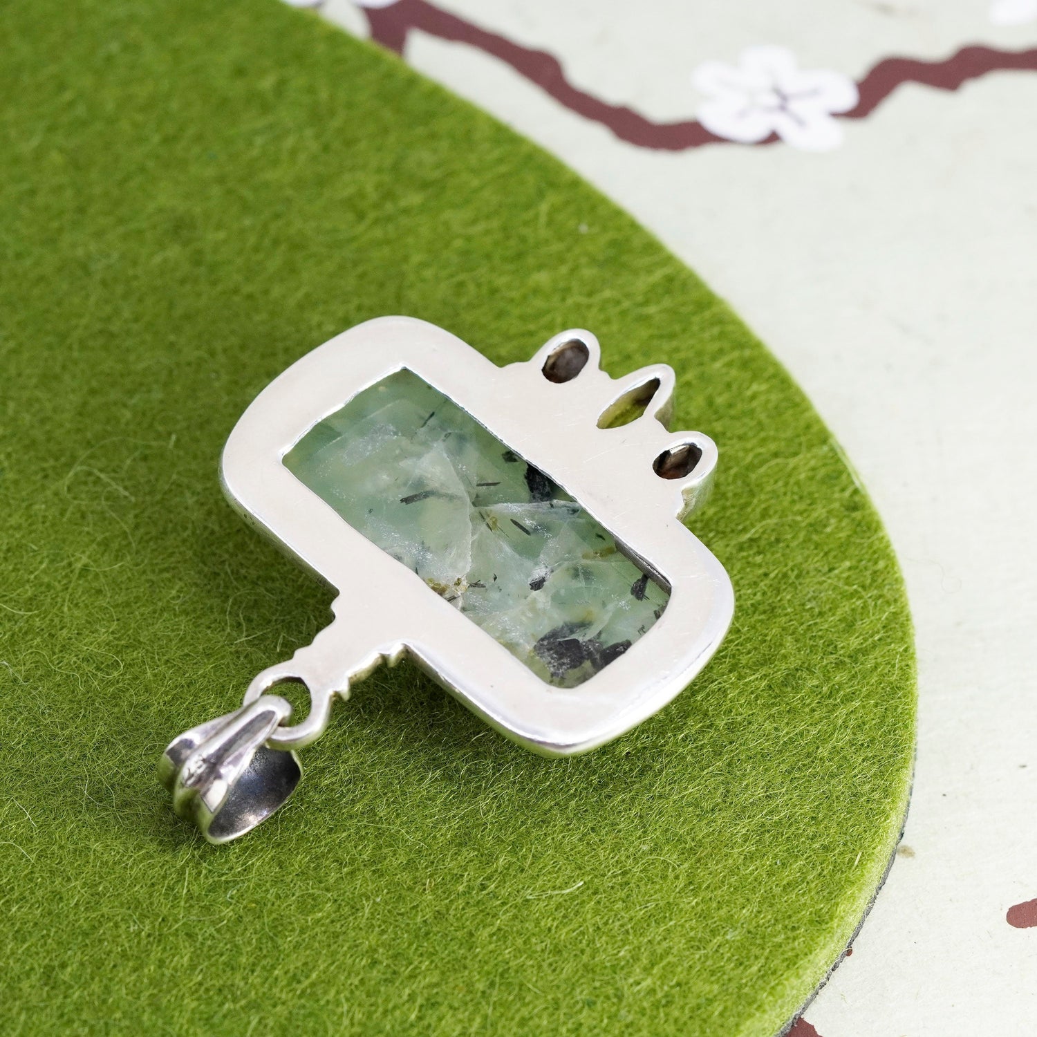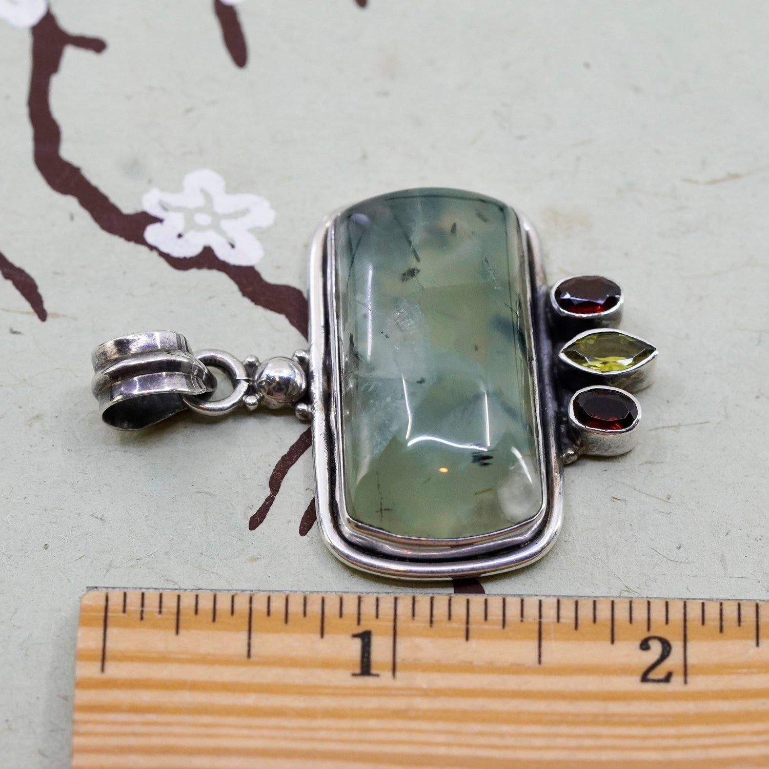 Vintage Sterling 925 silver handmade pendant with prehnite peridot and ruby, stamped 925