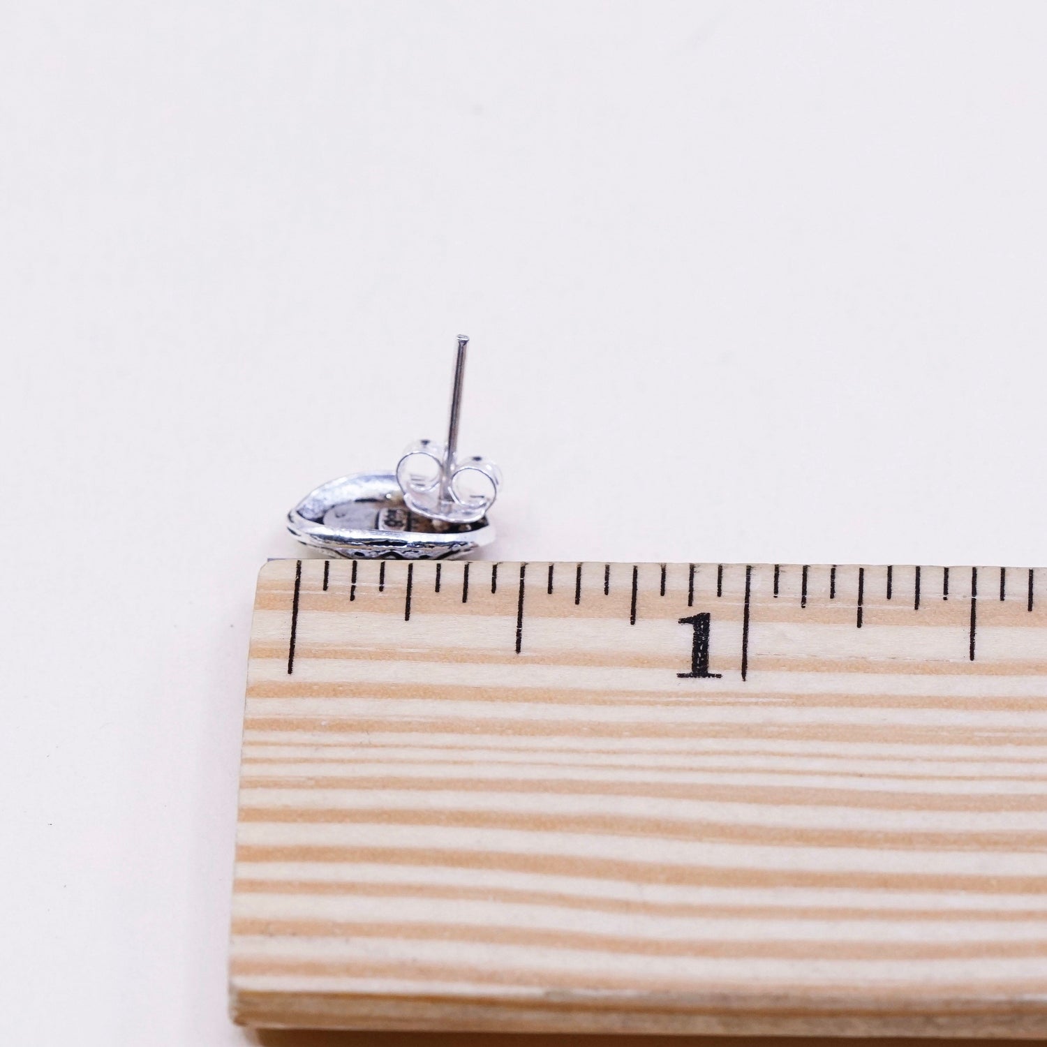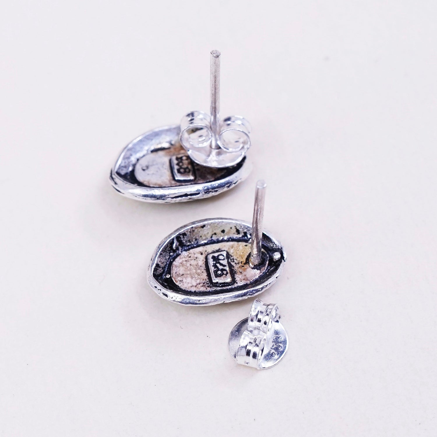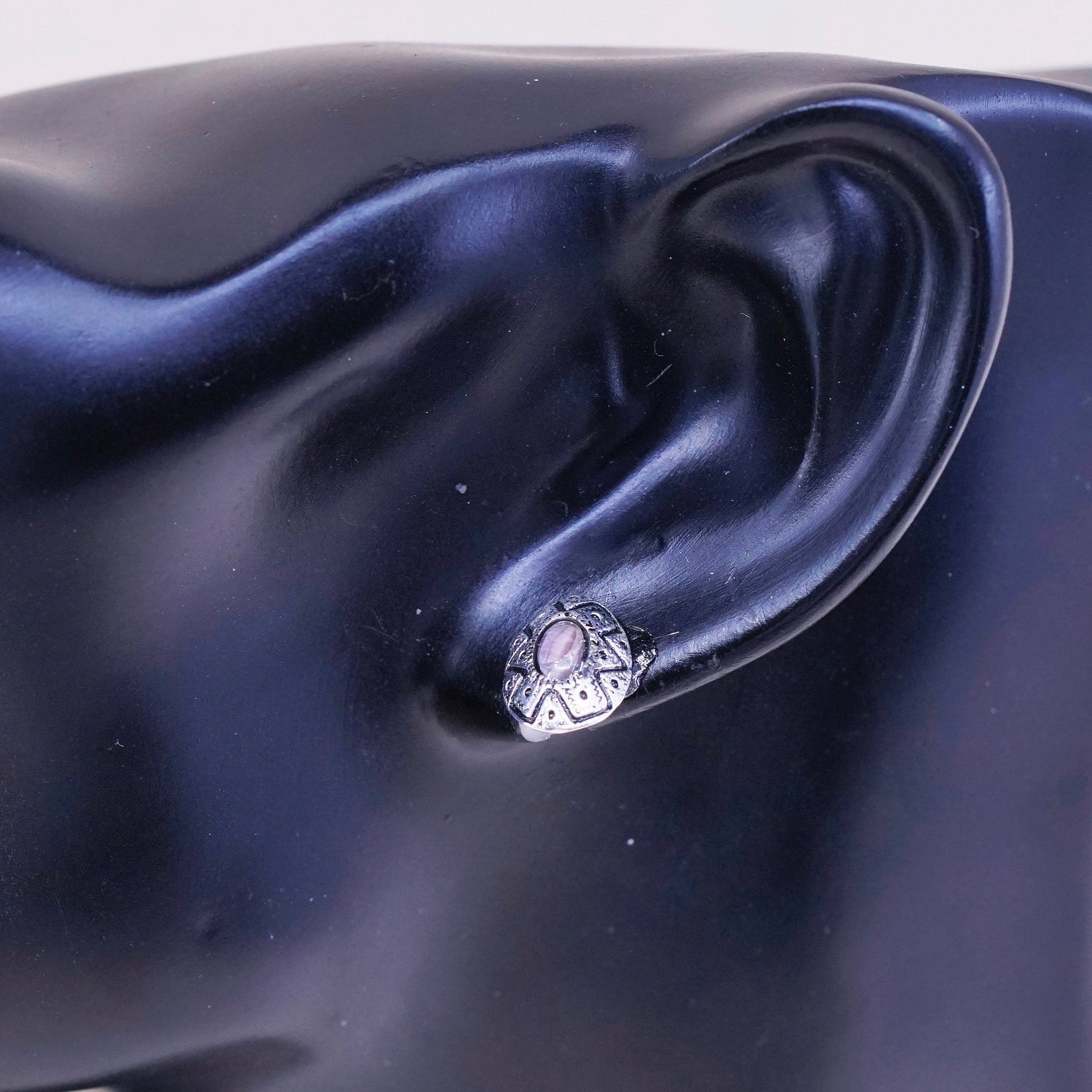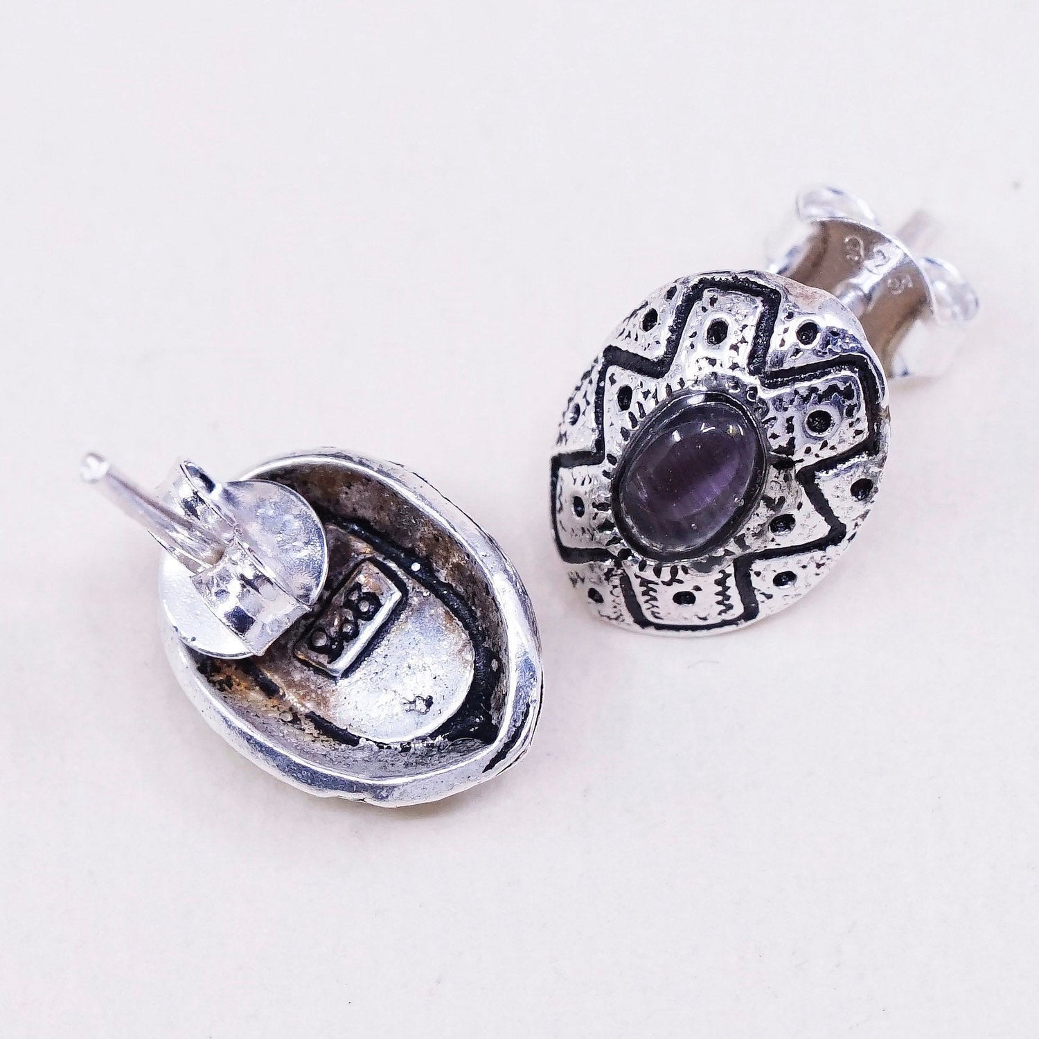 Vintage sterling silver earrings, 925 filigree studs with oval amethyst, stamped 925