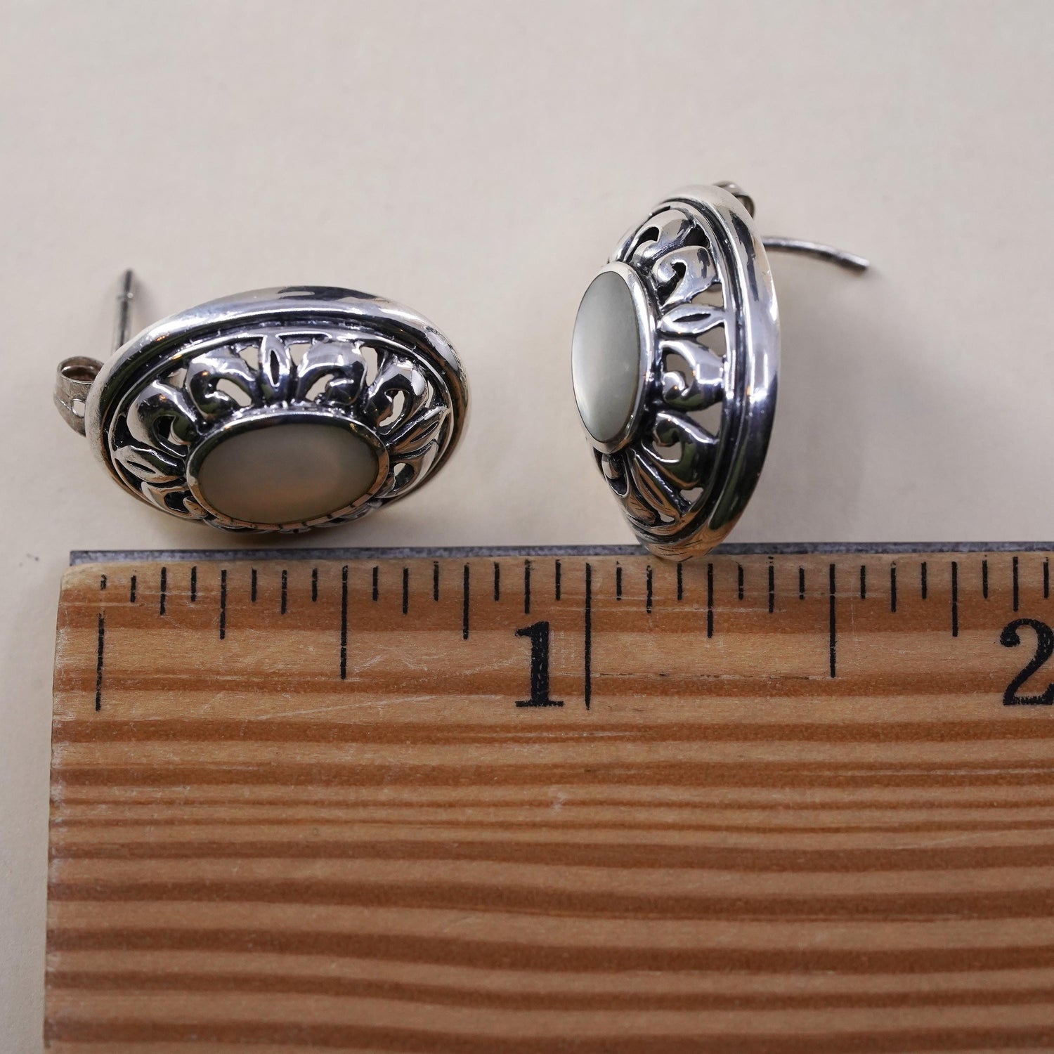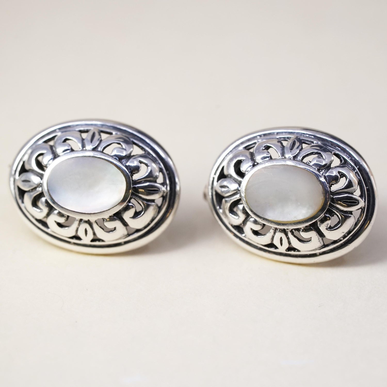 Vintage sterling silver earrings, 925 filigree studs with oval mother of pearl