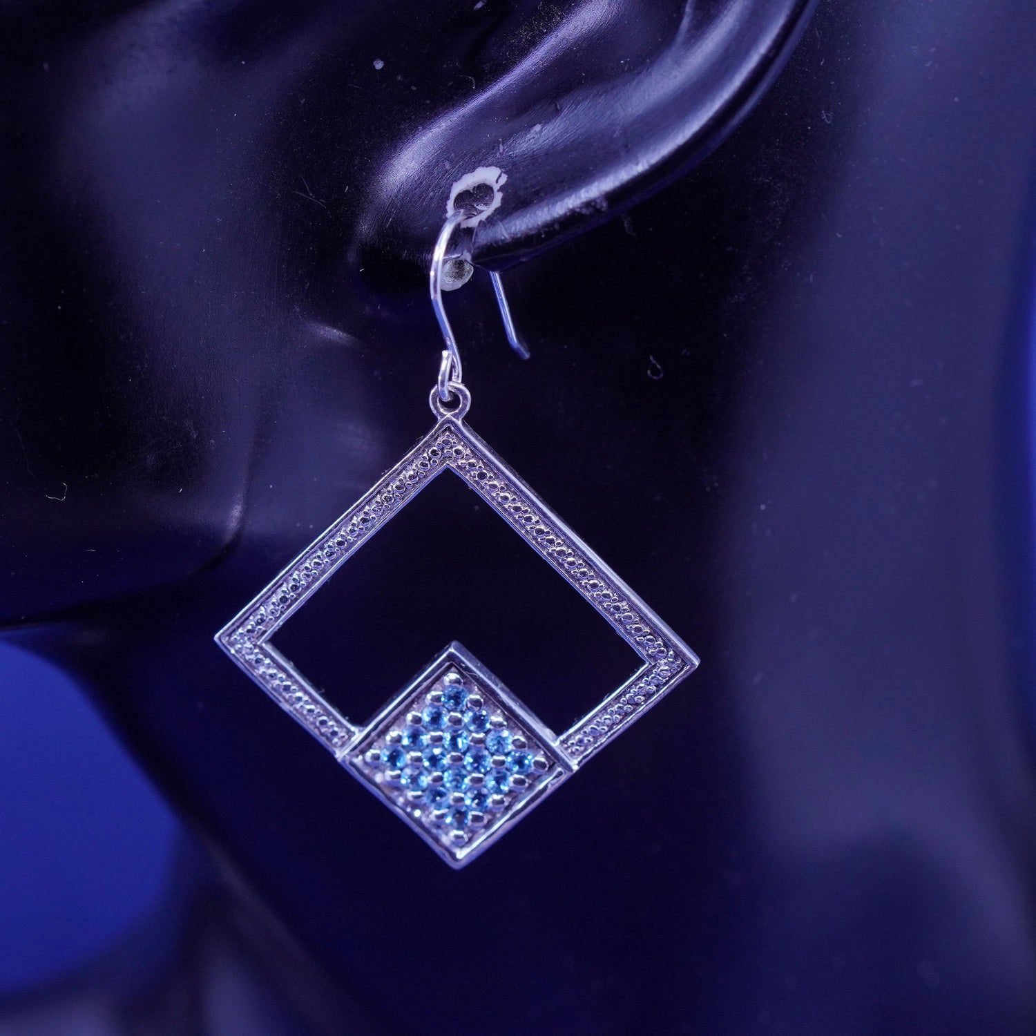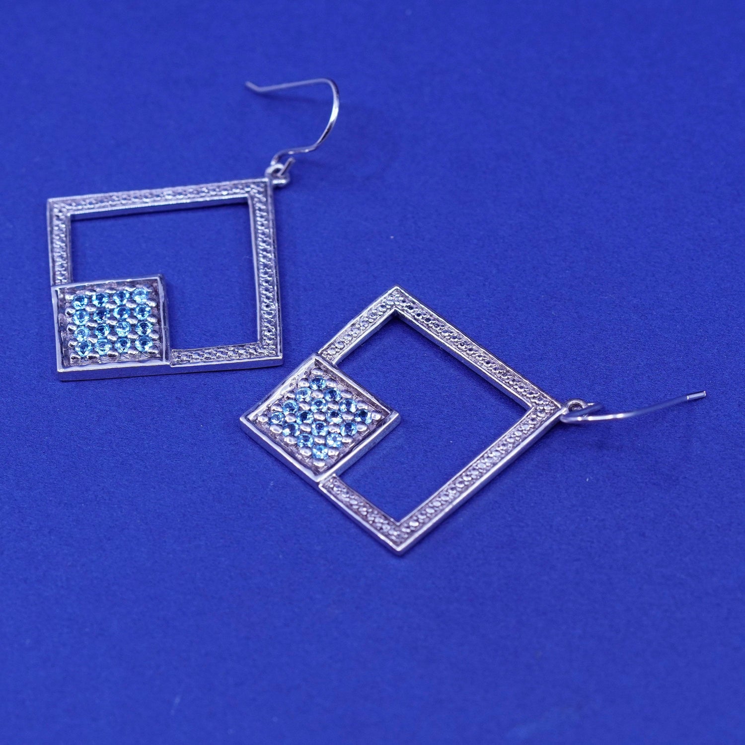 Vintage Sterling silver earrings, 925 square with cluster blue cz, stamped 925