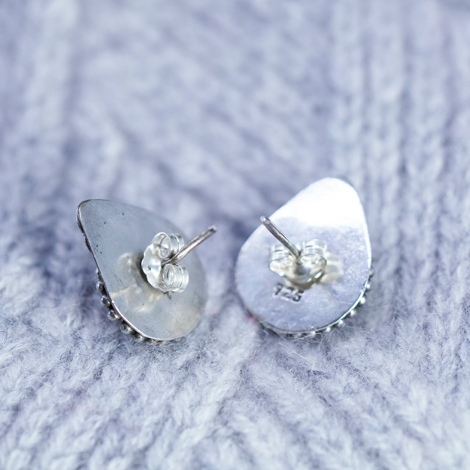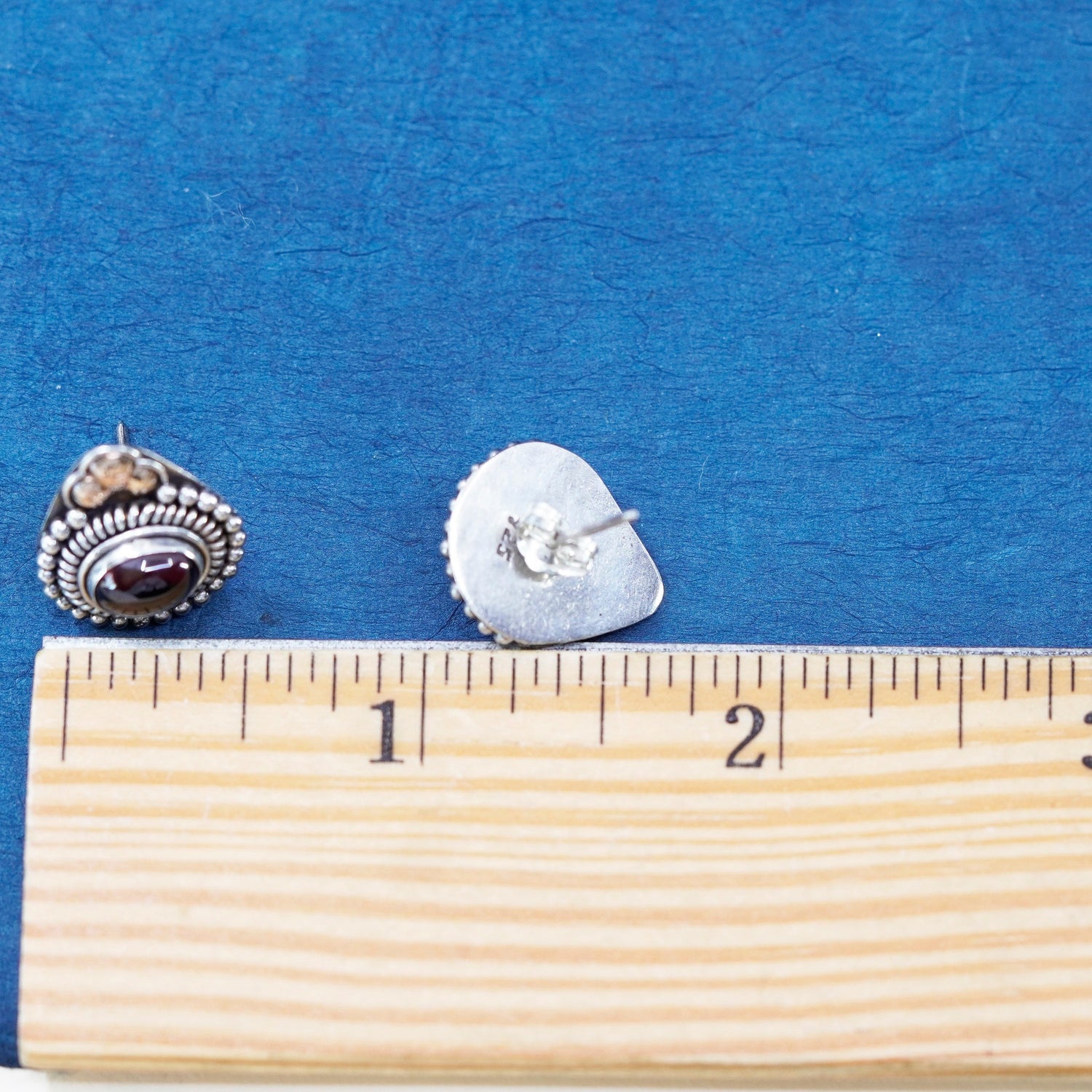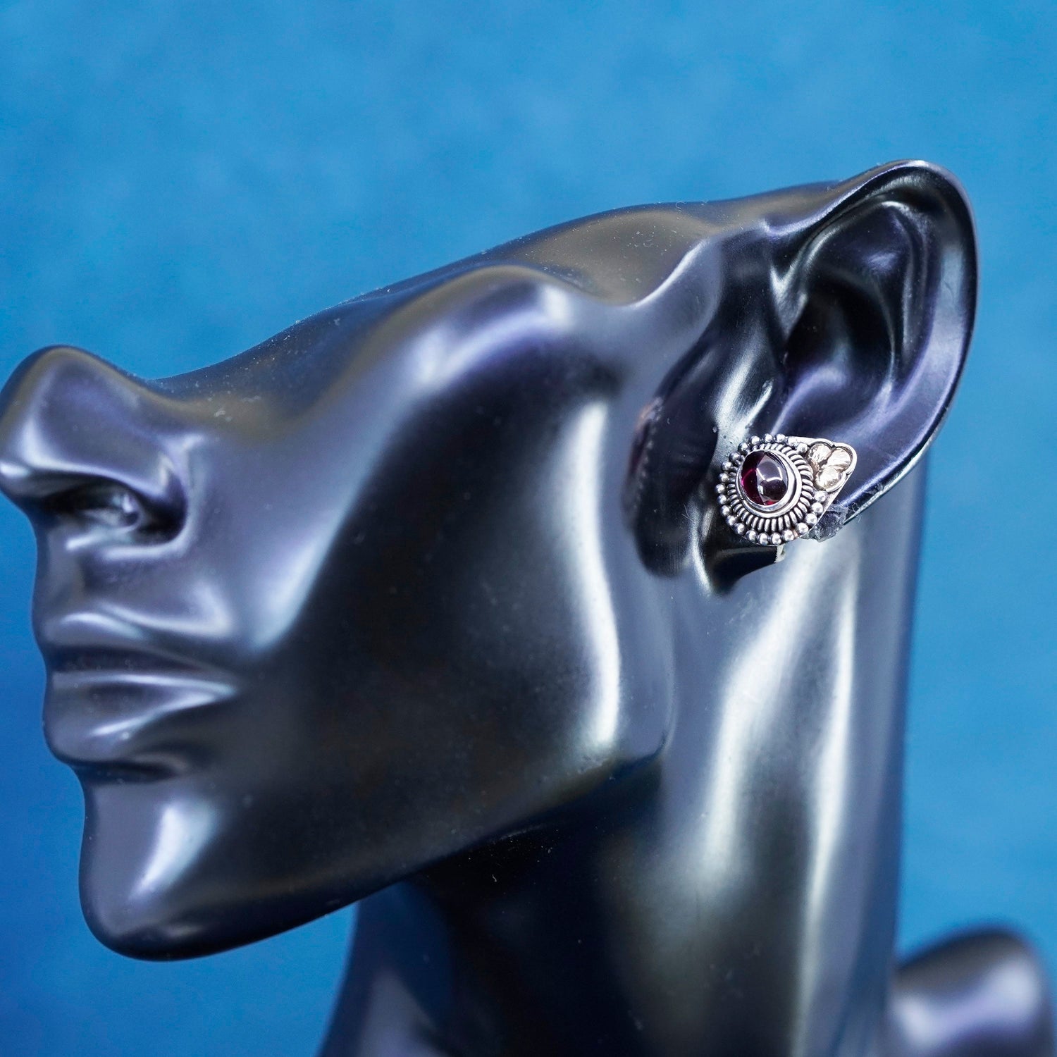Vintage sterling silver handmade earrings, 925 studs with garnet and 12K rose gold leaves, Stamped 925