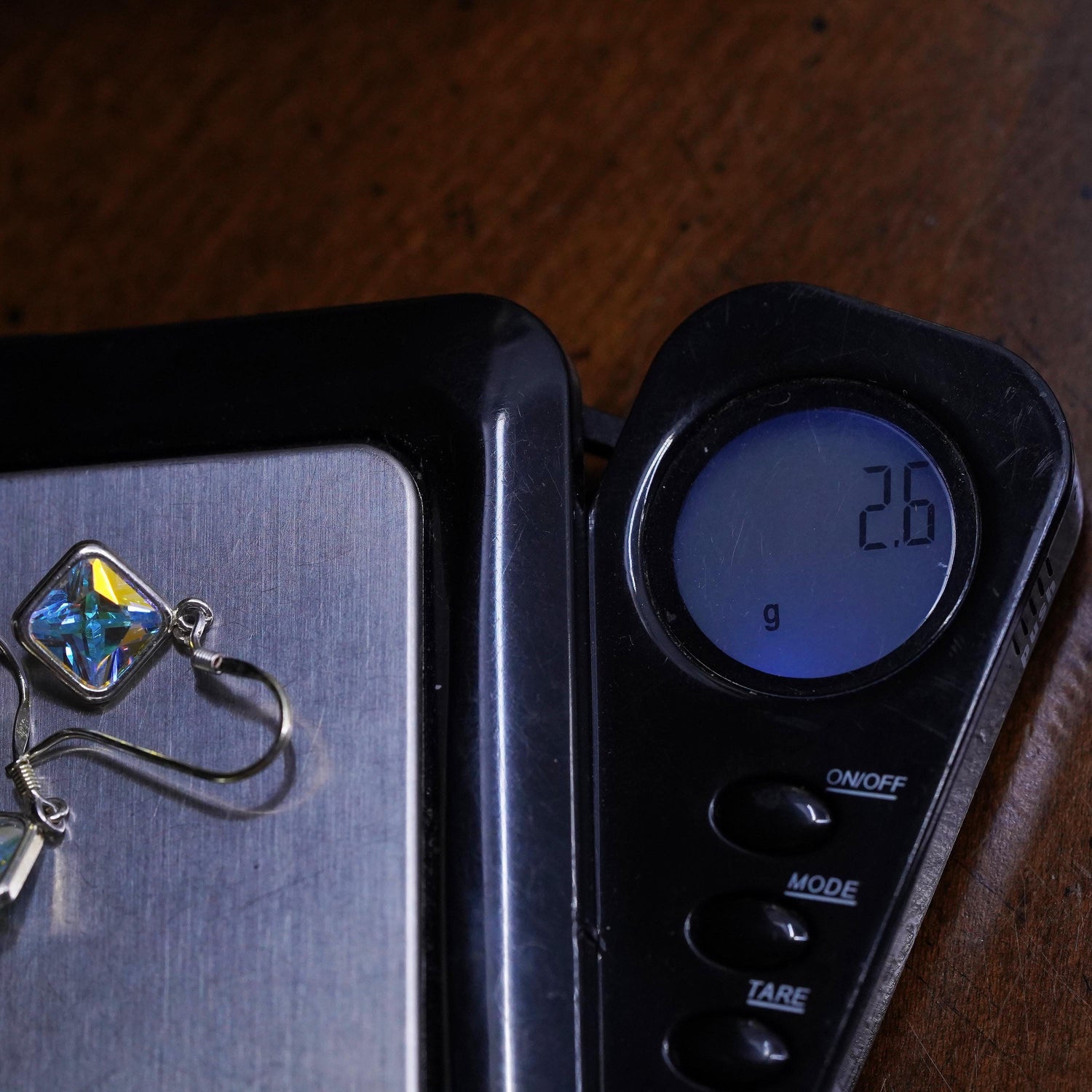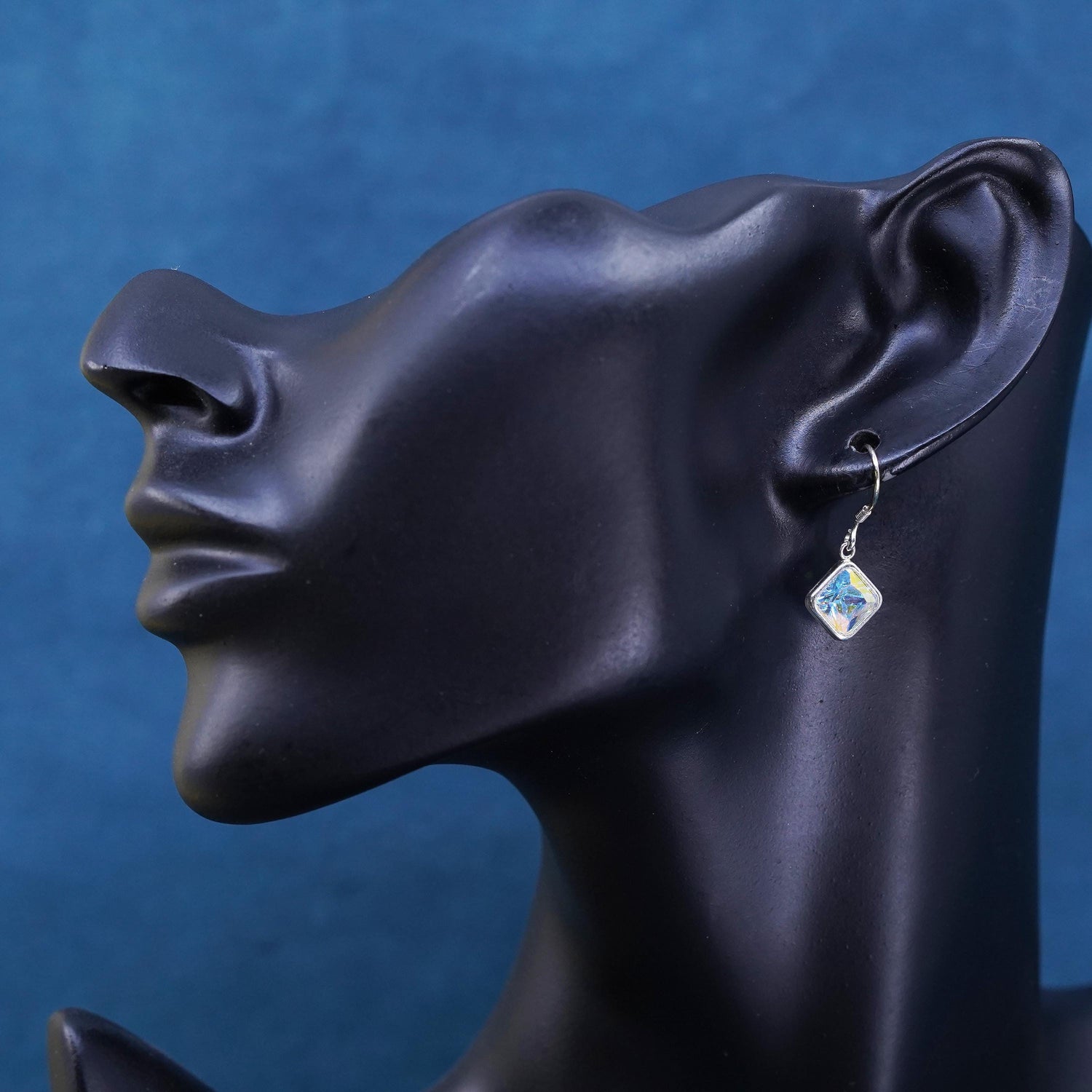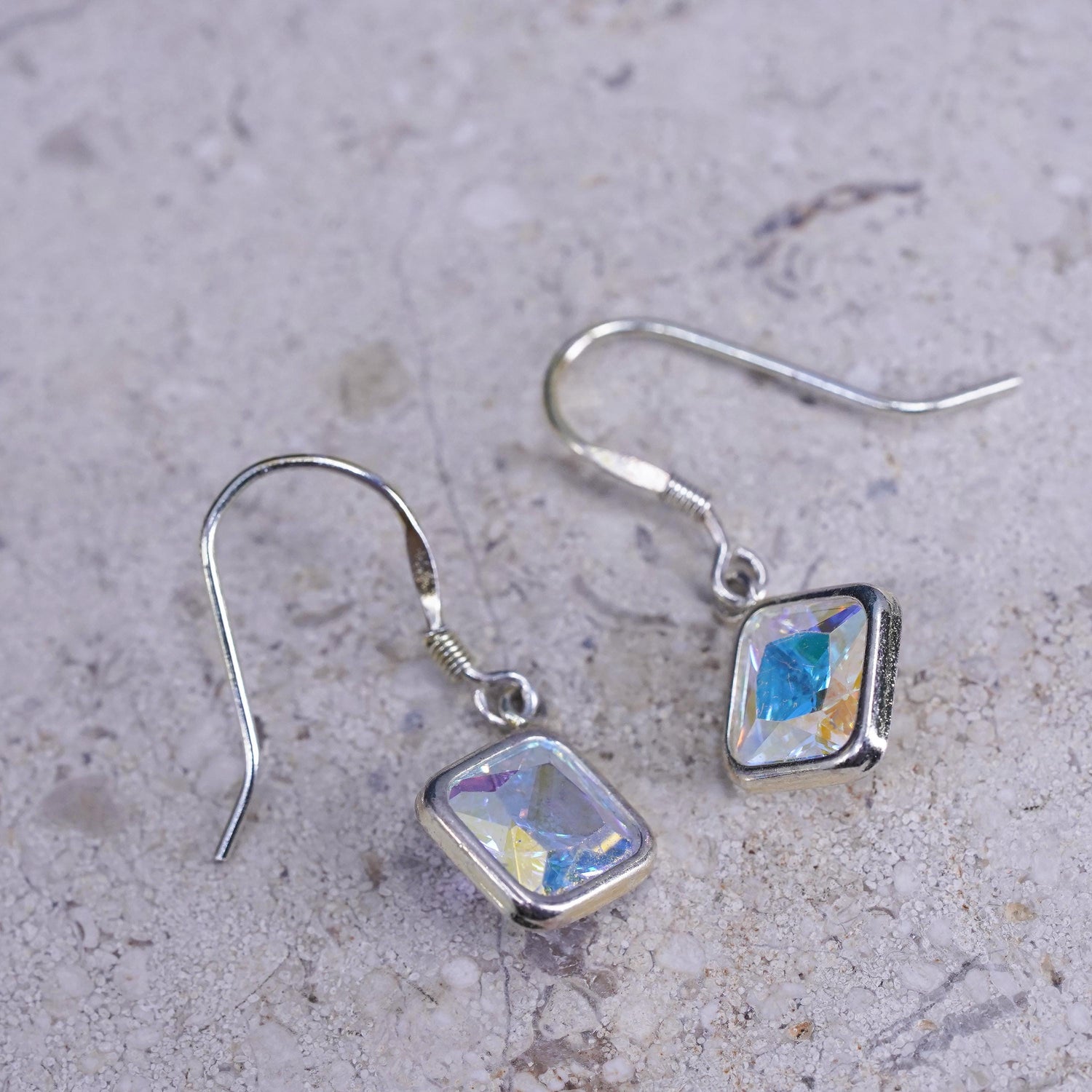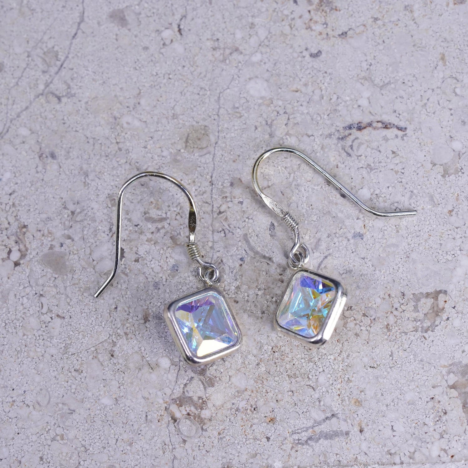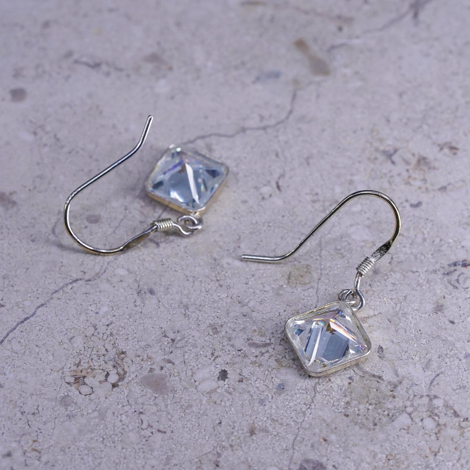 Vintage sterling Silver earrings, solid 925 silver square drops with Crystal