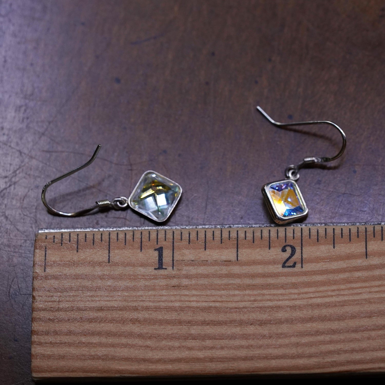 Vintage sterling Silver earrings, solid 925 silver square drops with Crystal, Stamped 925