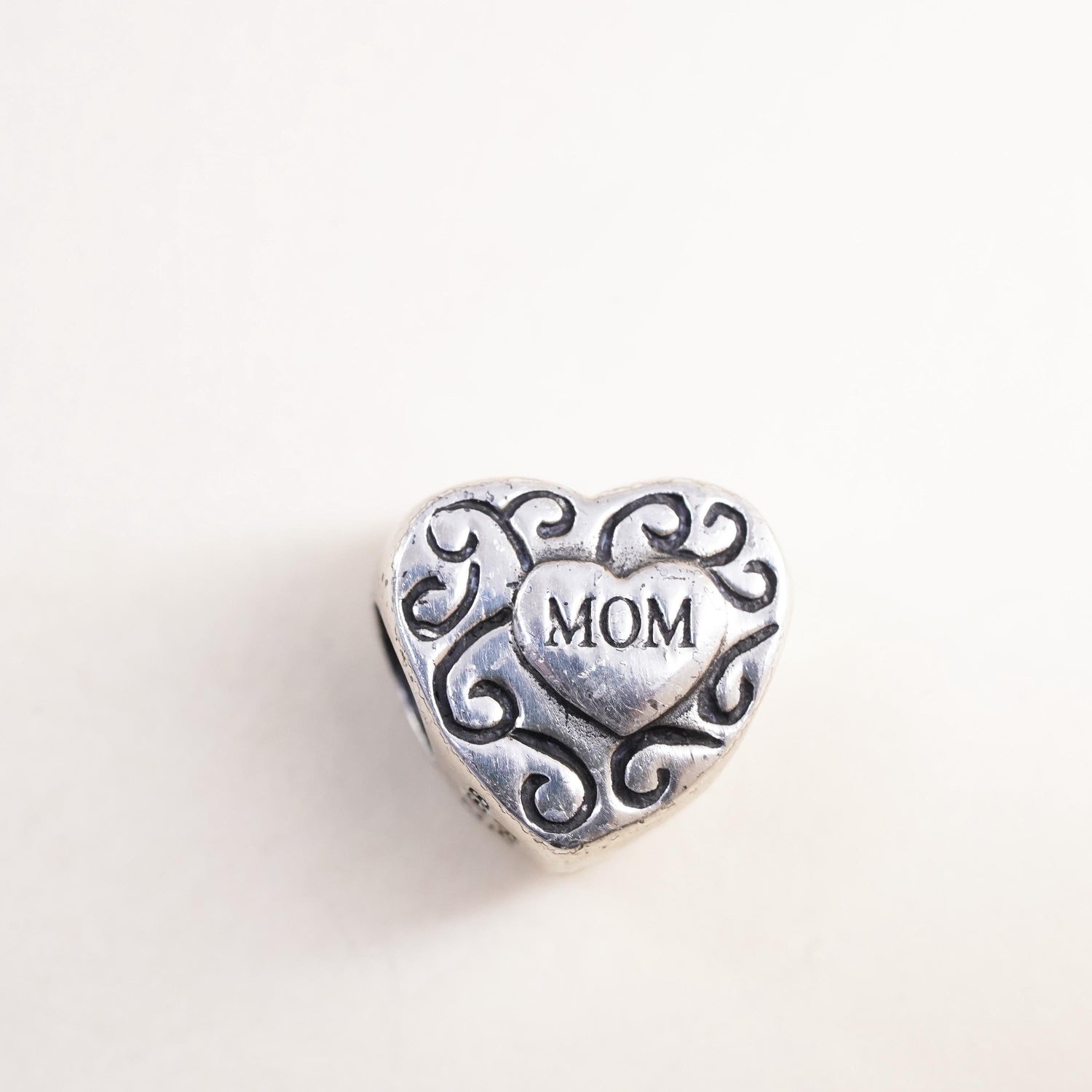 Vintage Sterling silver handmade bead charm, 925 heart pendant embossed mom