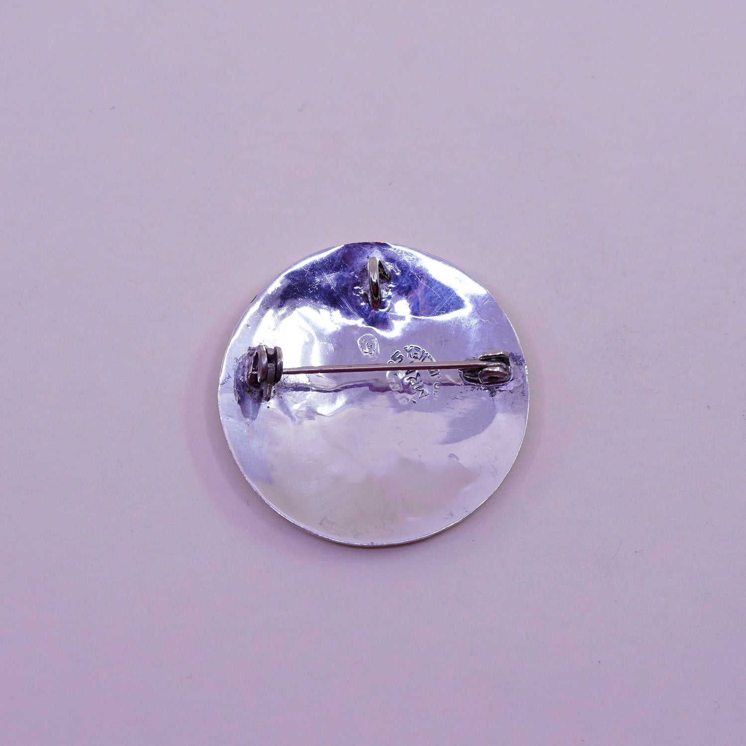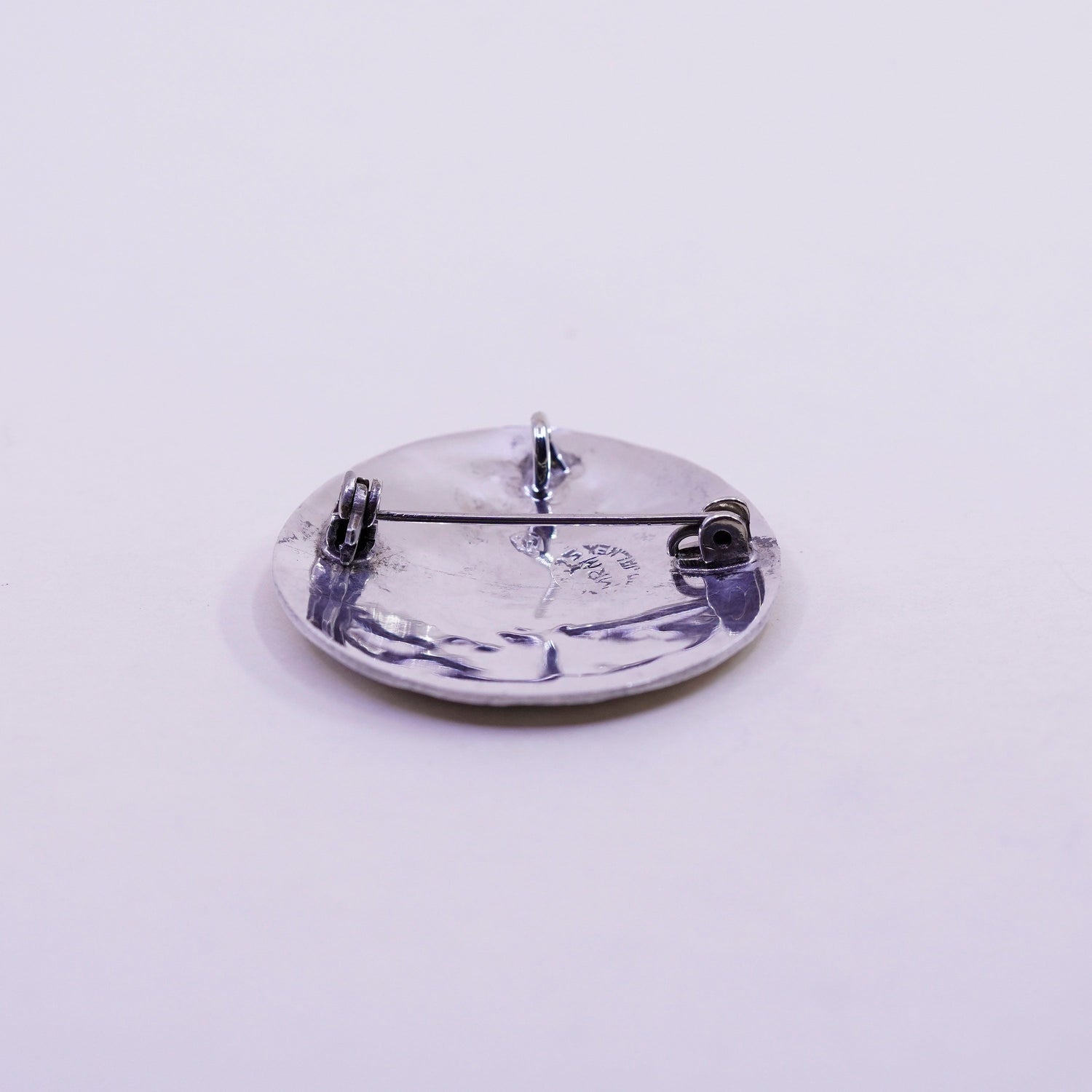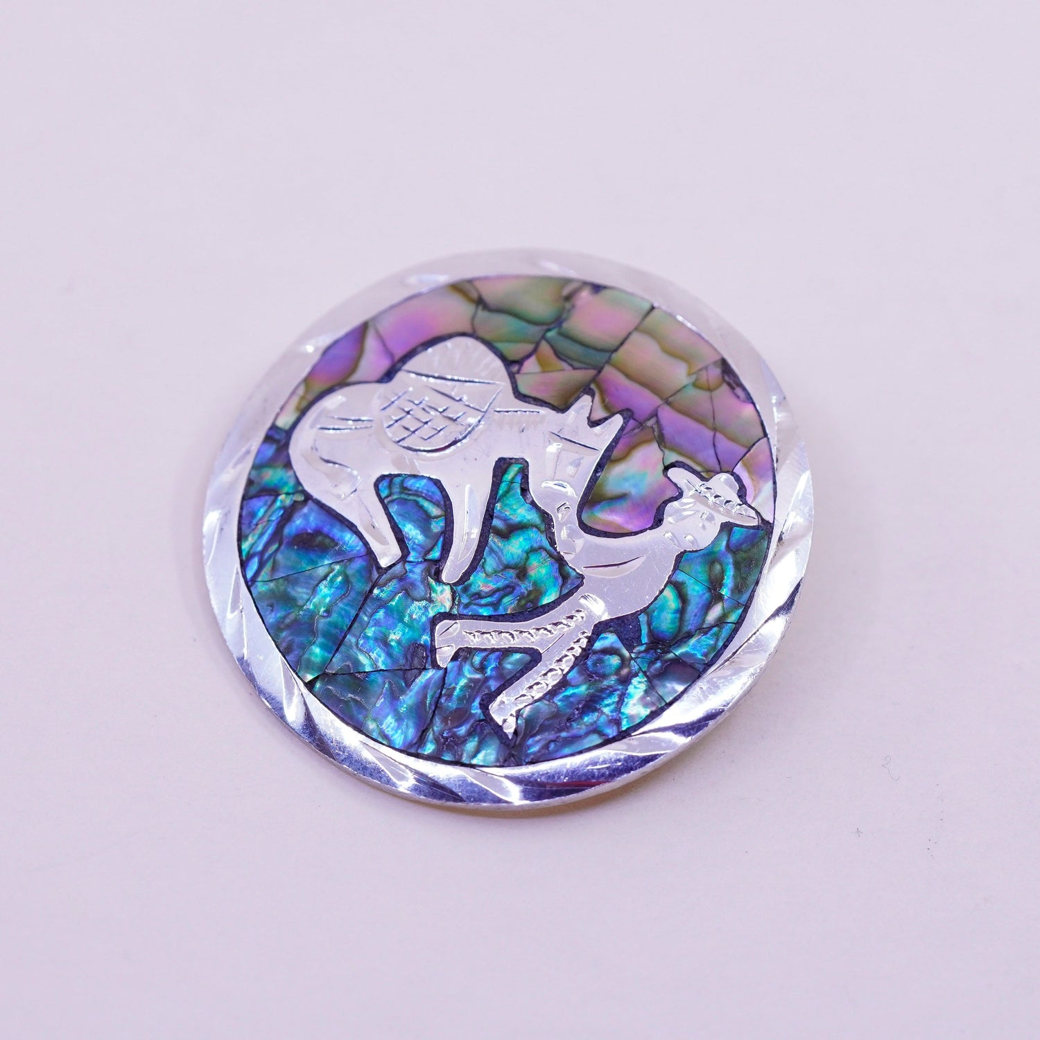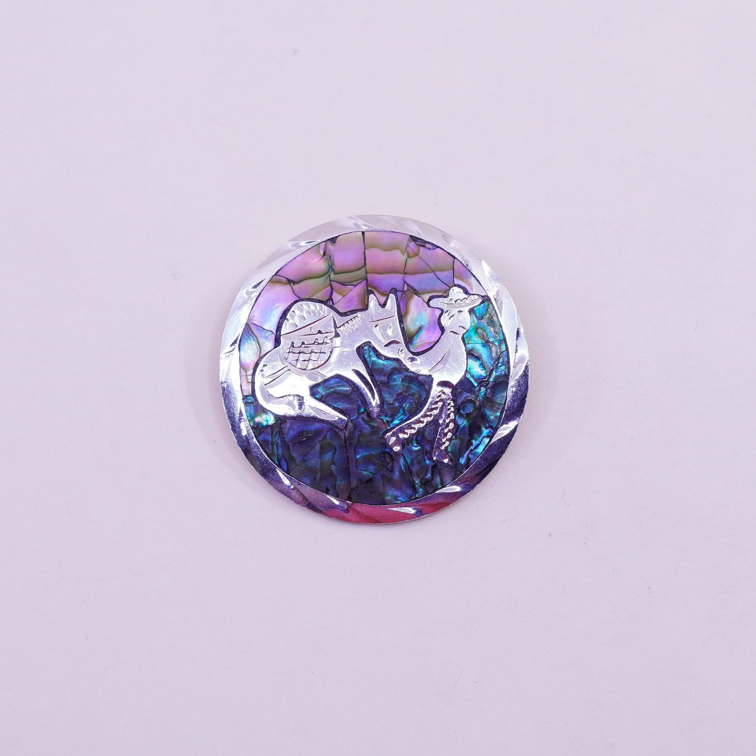 Vintage sterling silver handmade brooch, 925 circle pendant with donkey inlay and abalone details, stamped Mexico 925, signed MRM