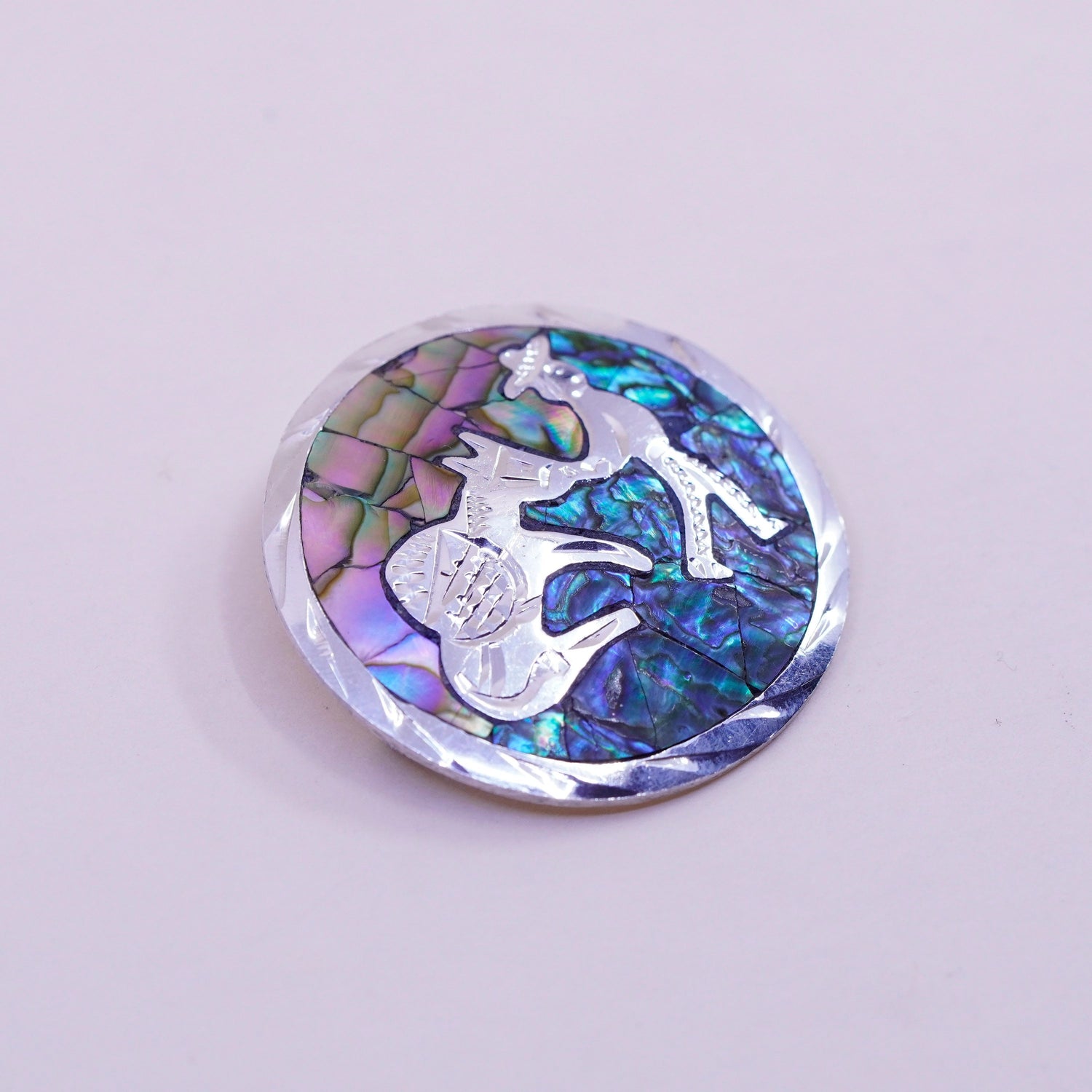Vintage sterling silver handmade brooch, 925 circle with donkey inlay abalone