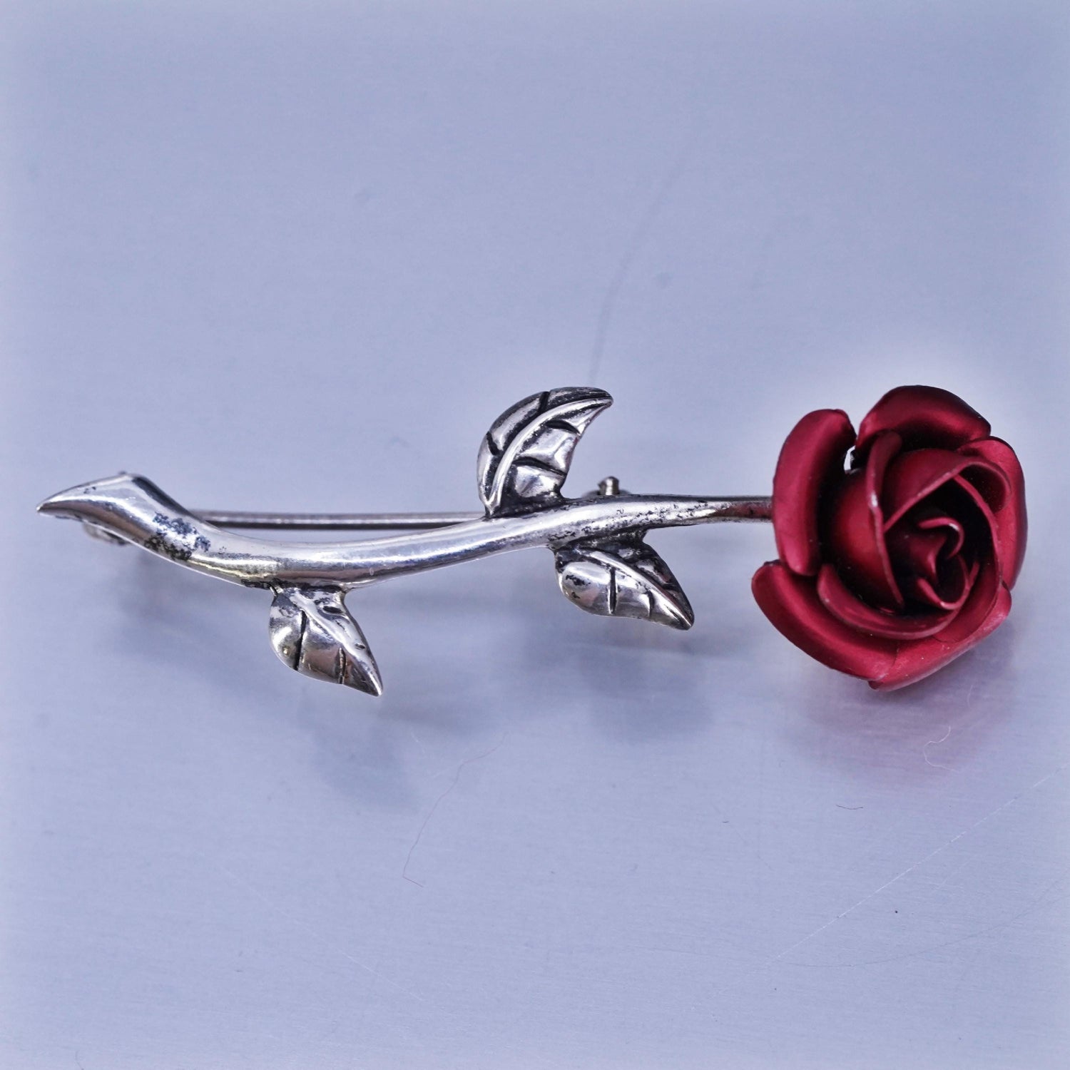 Vintage sterling silver handmade brooch, 925 rose flower pin, stamped 925