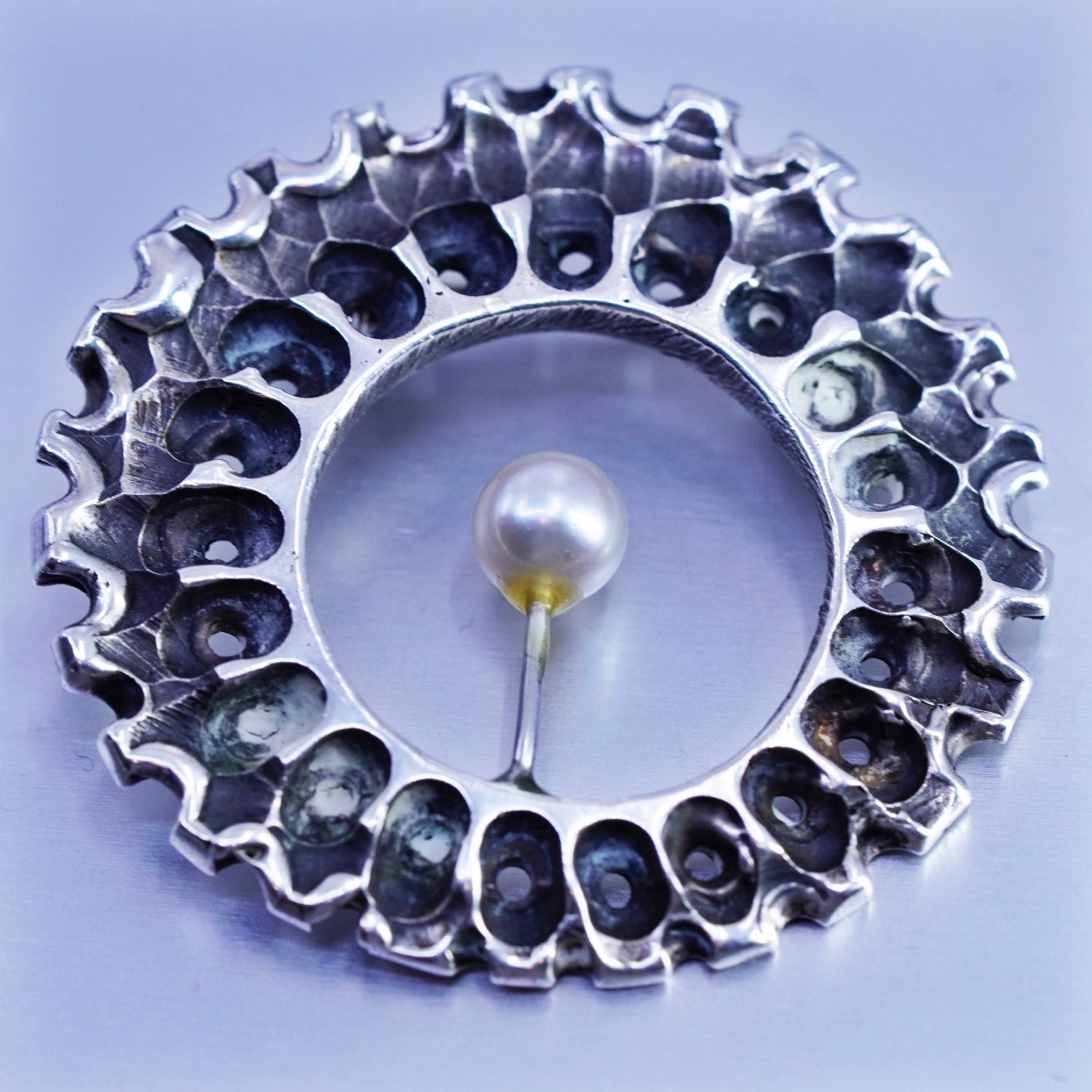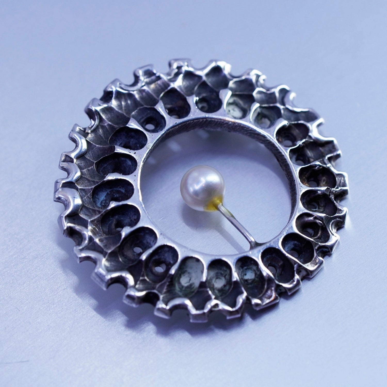 Vintage sterling silver handmade brooch, modern 925 circle pin and pearl, stamped Sterling