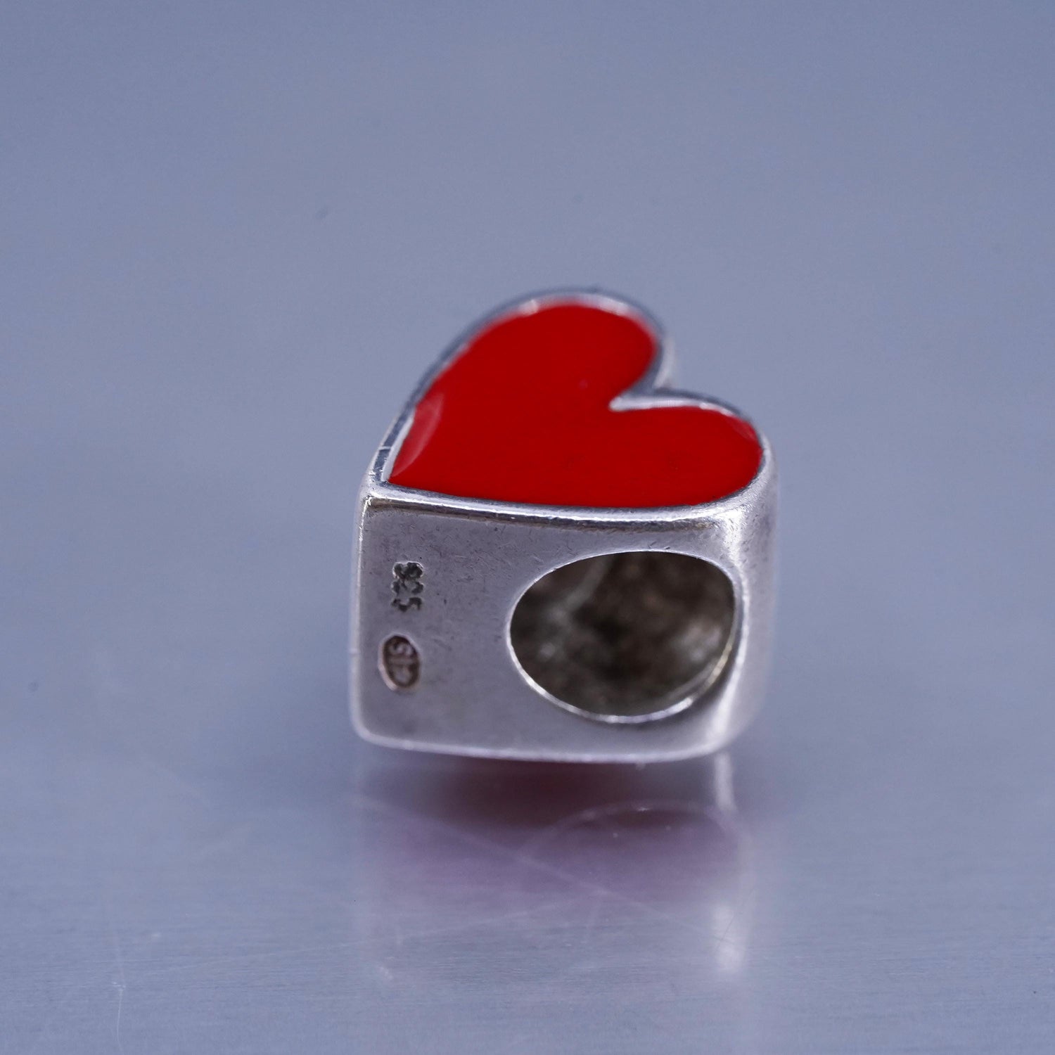 Vintage Sterling silver handmade charm, 925 red enamel heart bead, Stamped 925