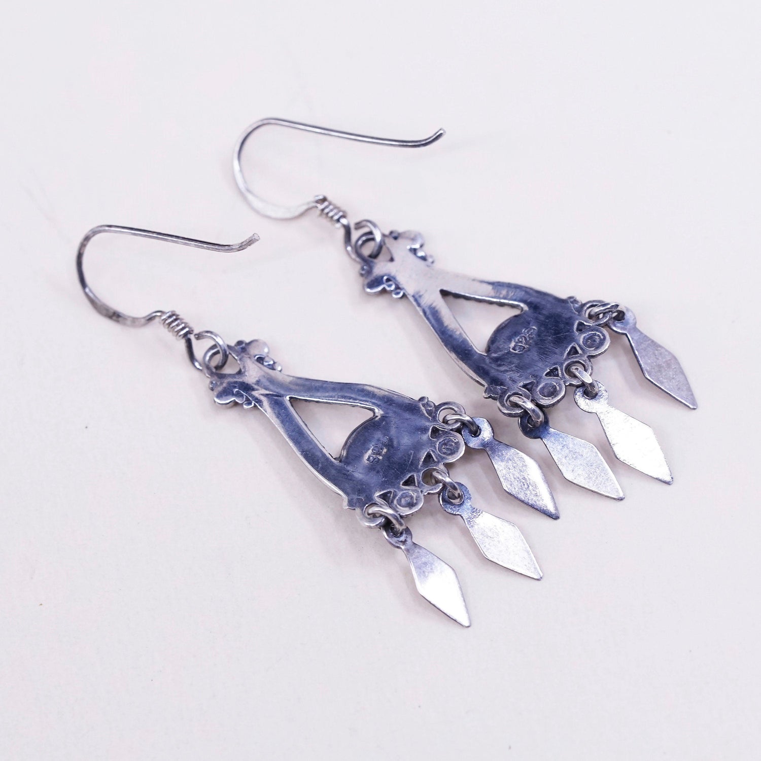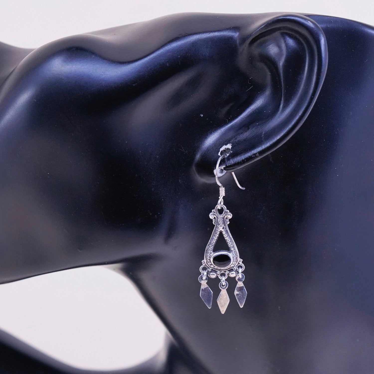 Vintage Sterling silver handmade earrings, 925 drops with obsidian and fringe details, stamped 925