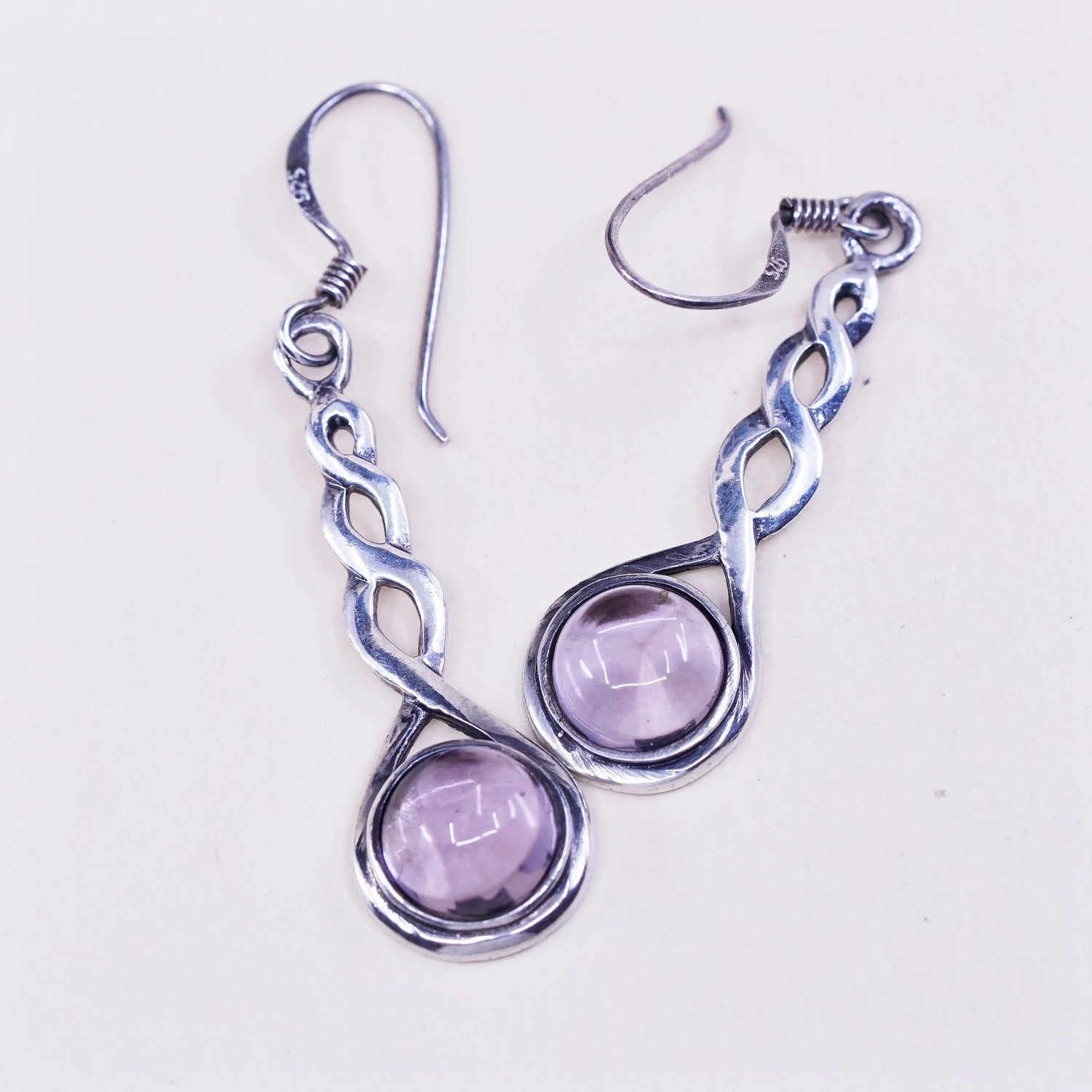 Vintage sterling silver handmade earrings, 925 twisted drops with amethyst
