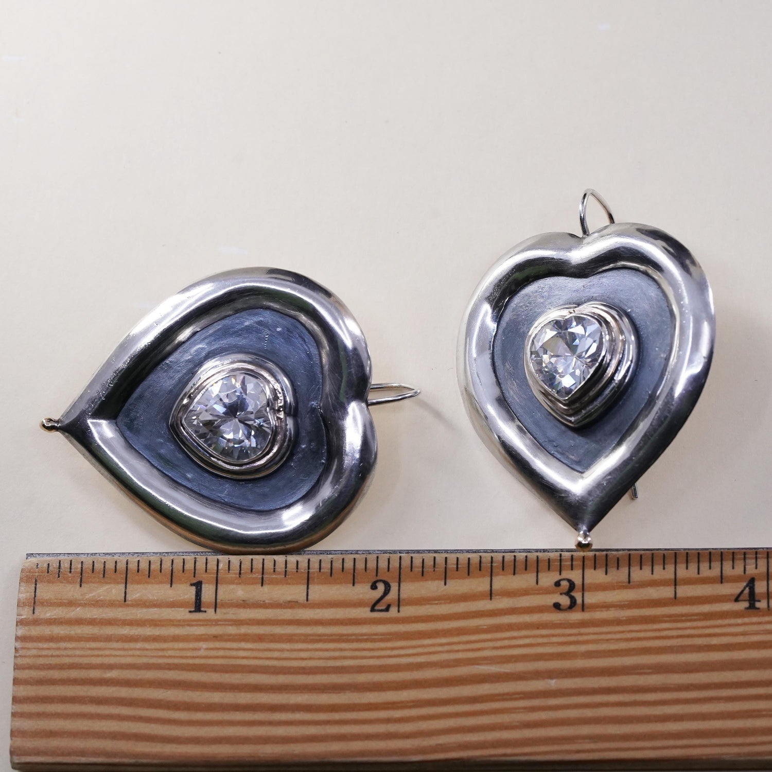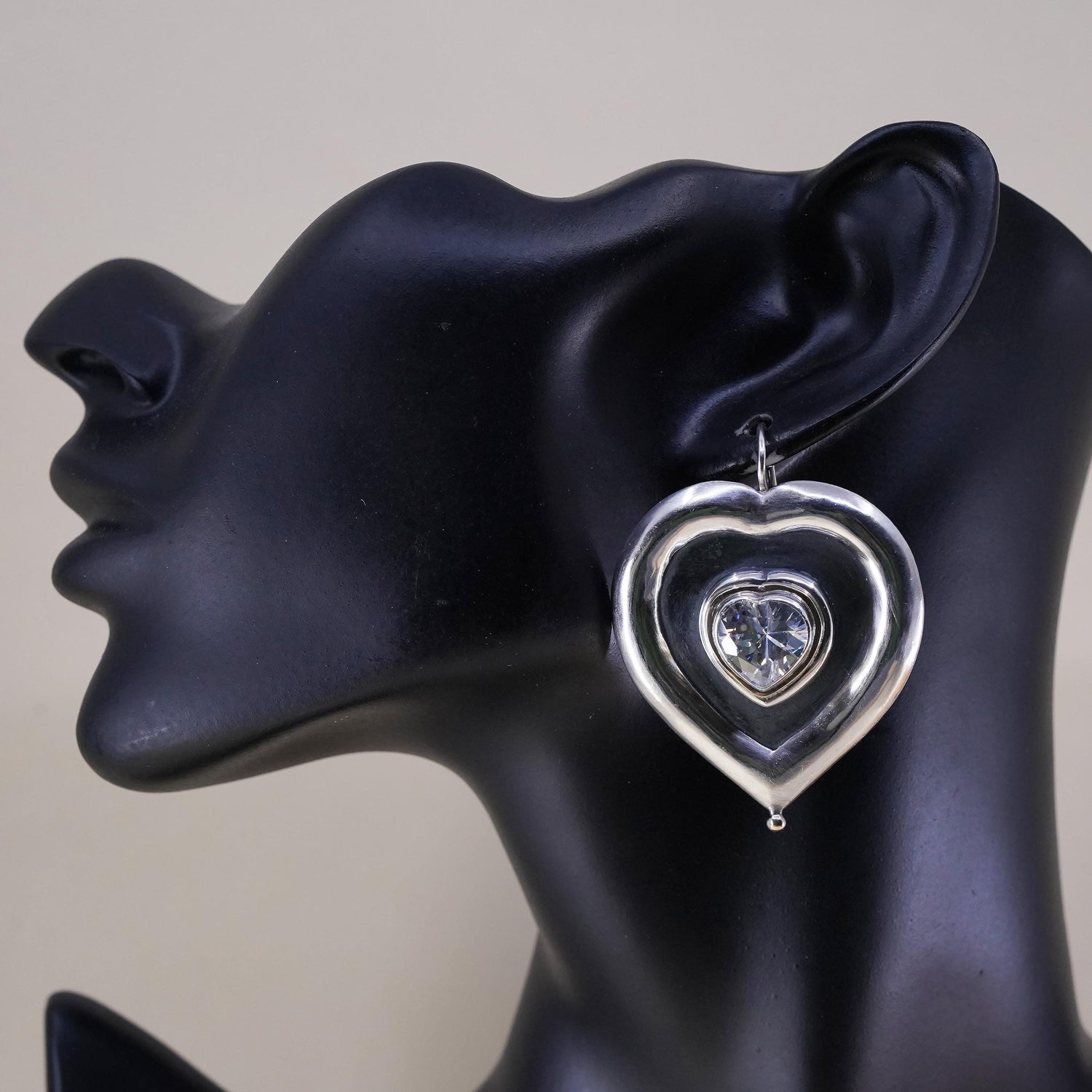 Vintage sterling silver handmade earrings, huge 925 silver heart with CZ