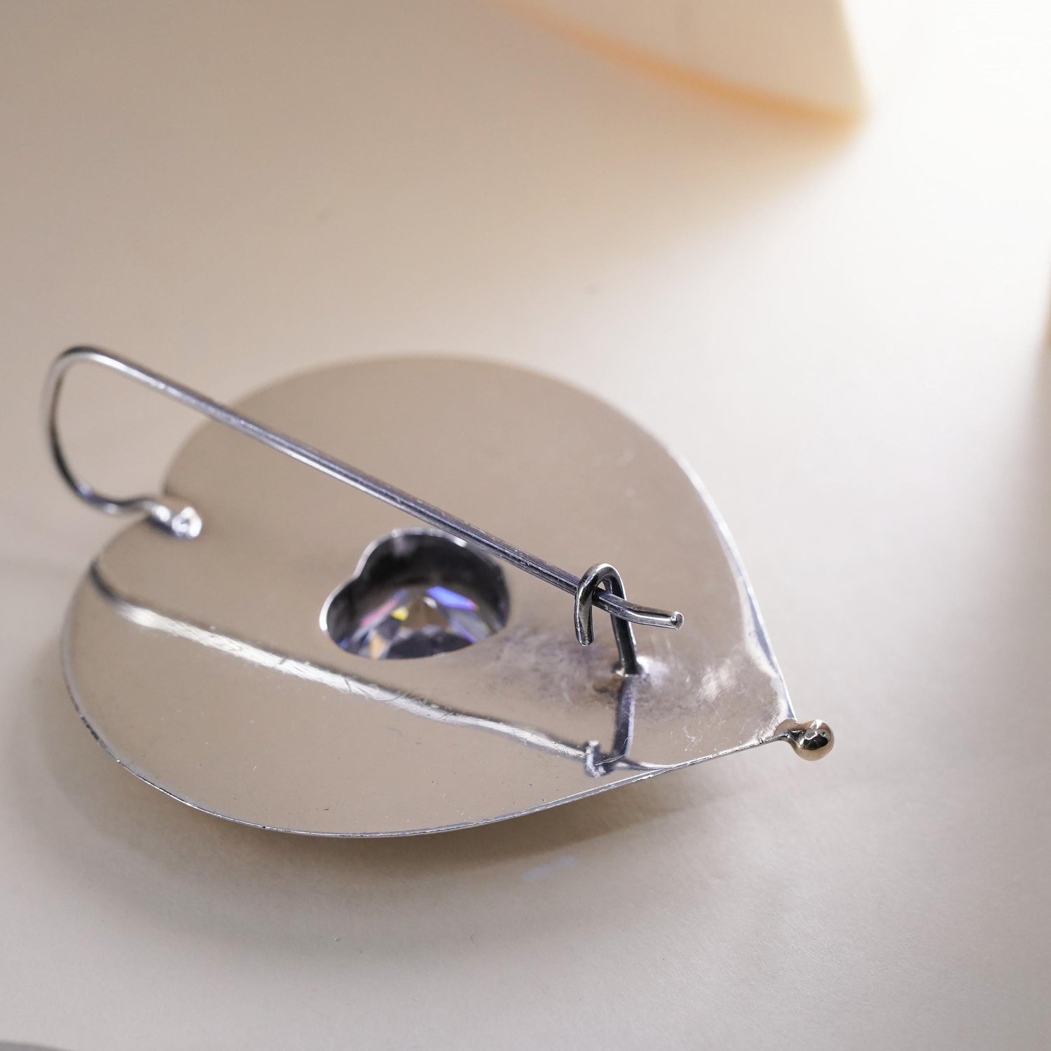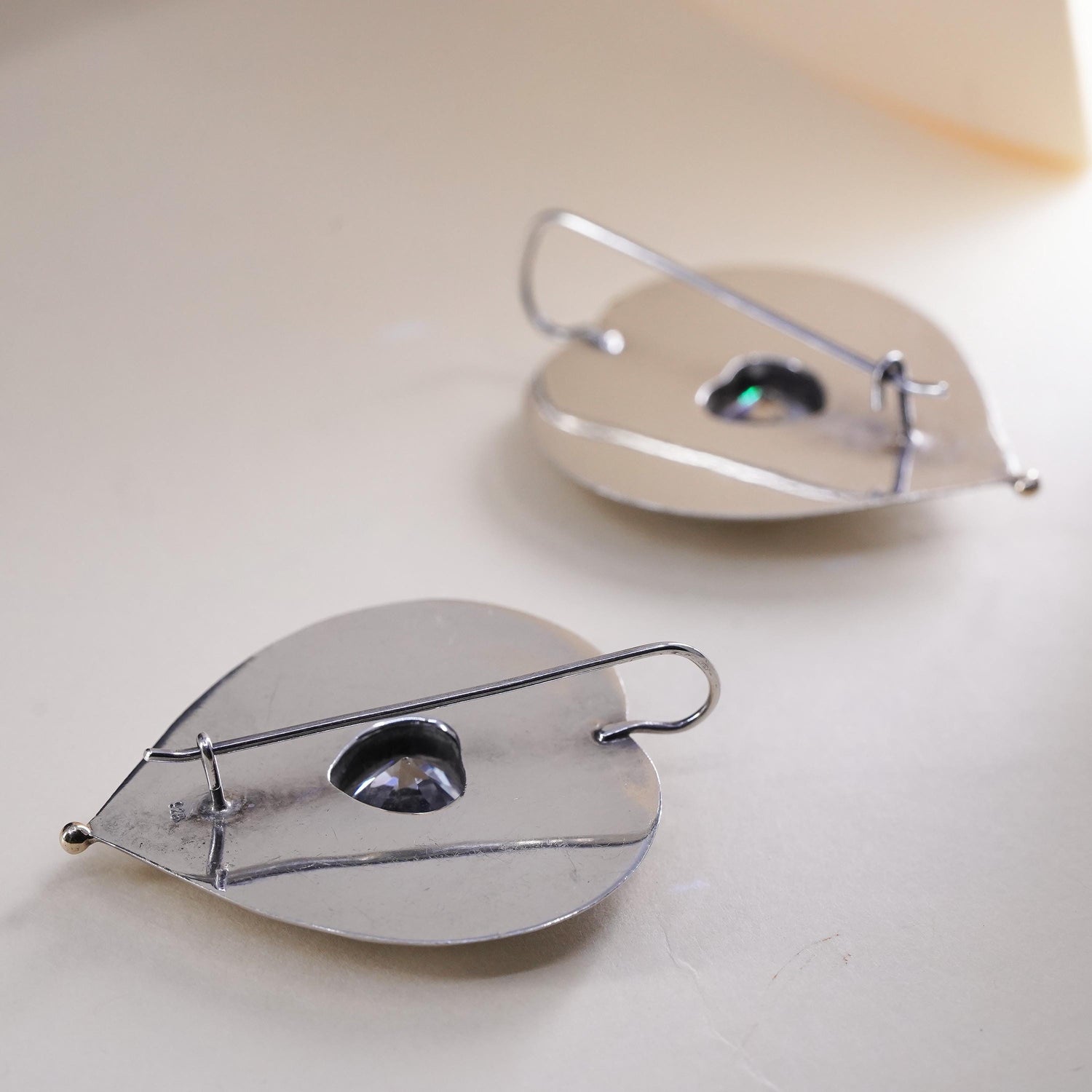 Vintage sterling silver handmade earrings, huge 925 silver heart with CZ, stamped 925