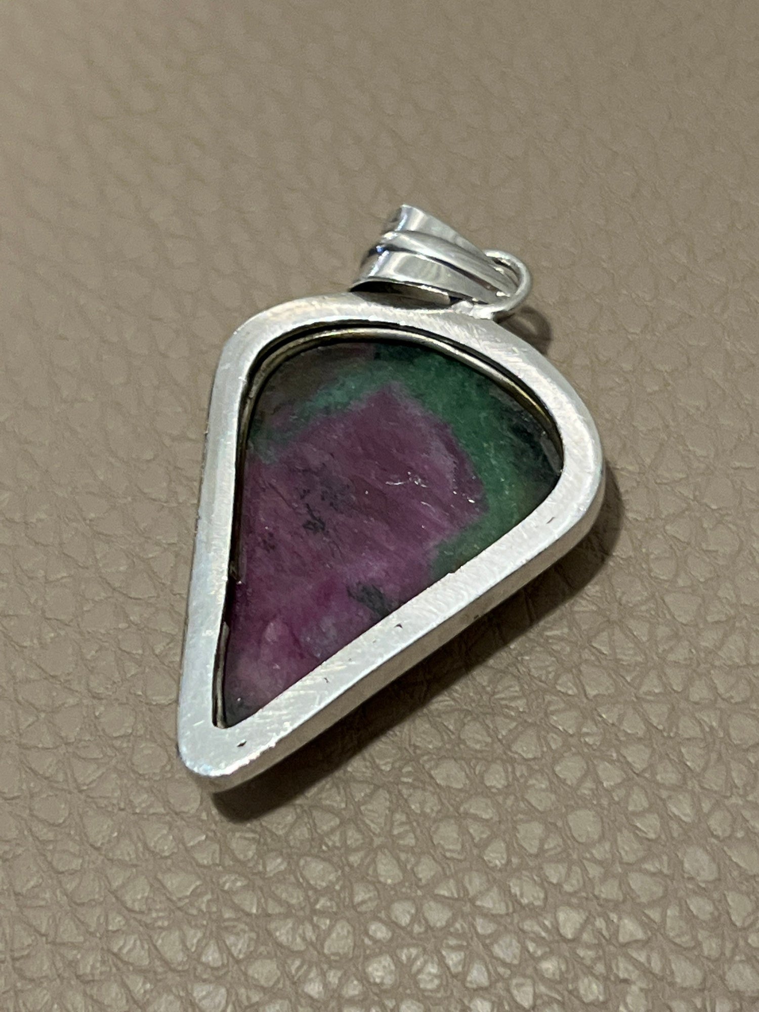 Vintage sterling silver handmade pendant, Mexican 925 teardrop with ruby zoisite inlay, stamped 925