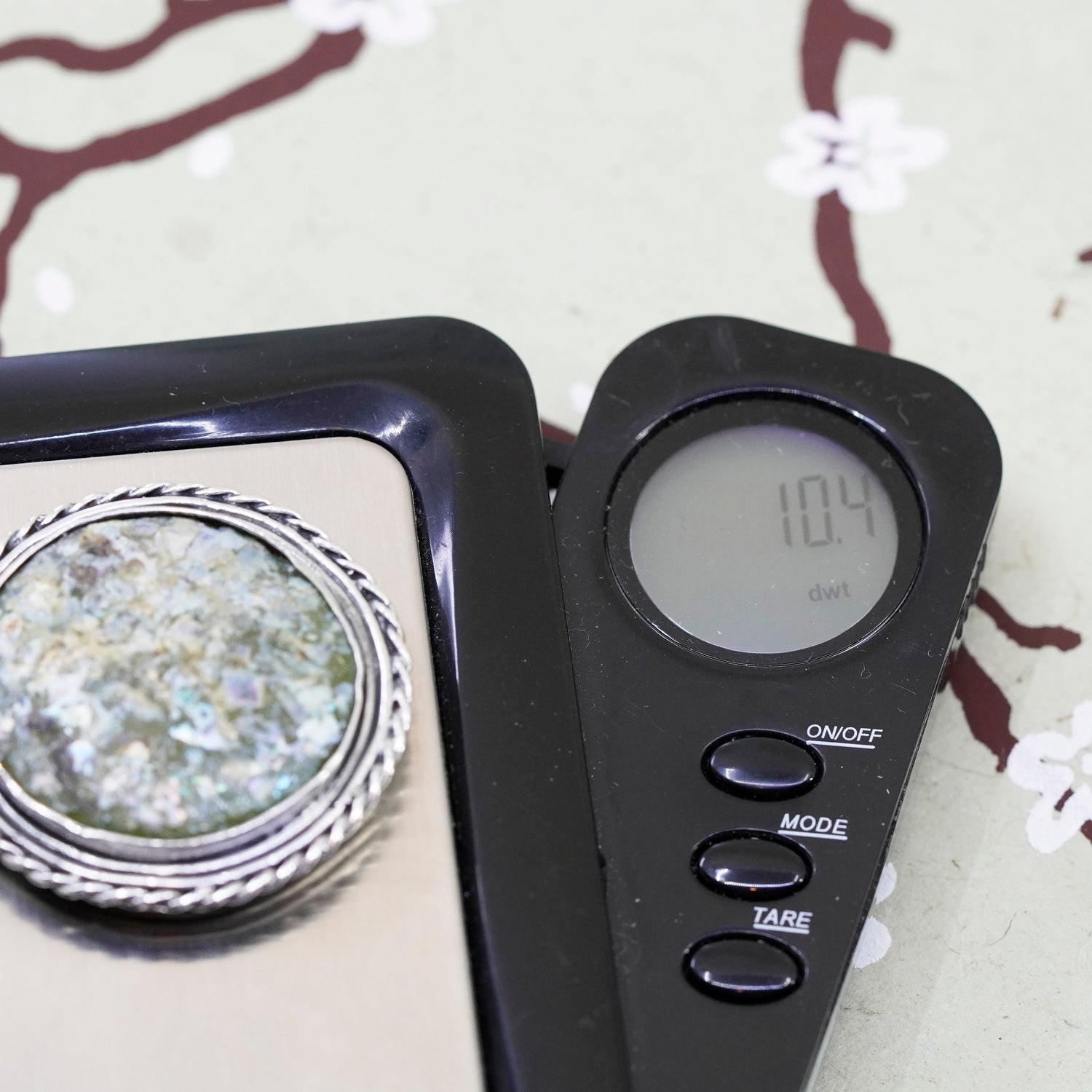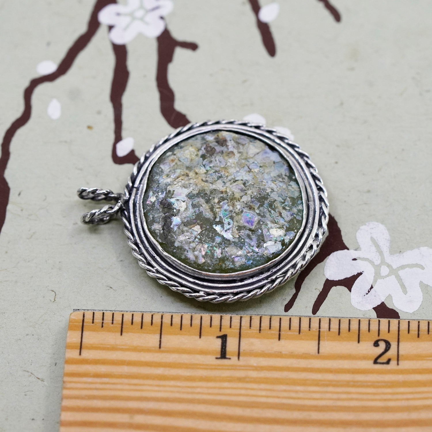 Vintage sterling silver handmade pendant, round Big Roman glass charm, silver tested