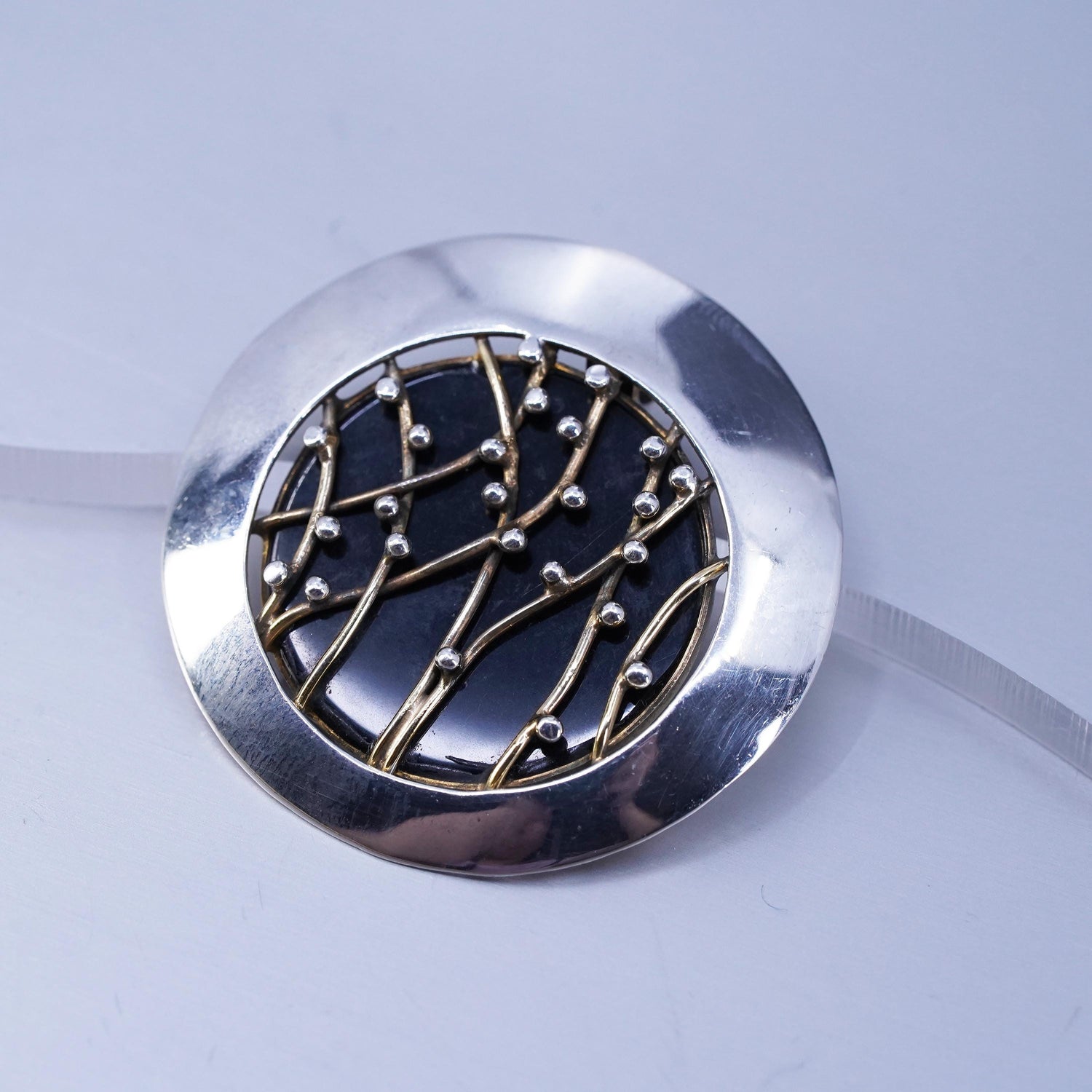 Vintage two tone brase sterling 925 silver circle pendant charm with onyx beads