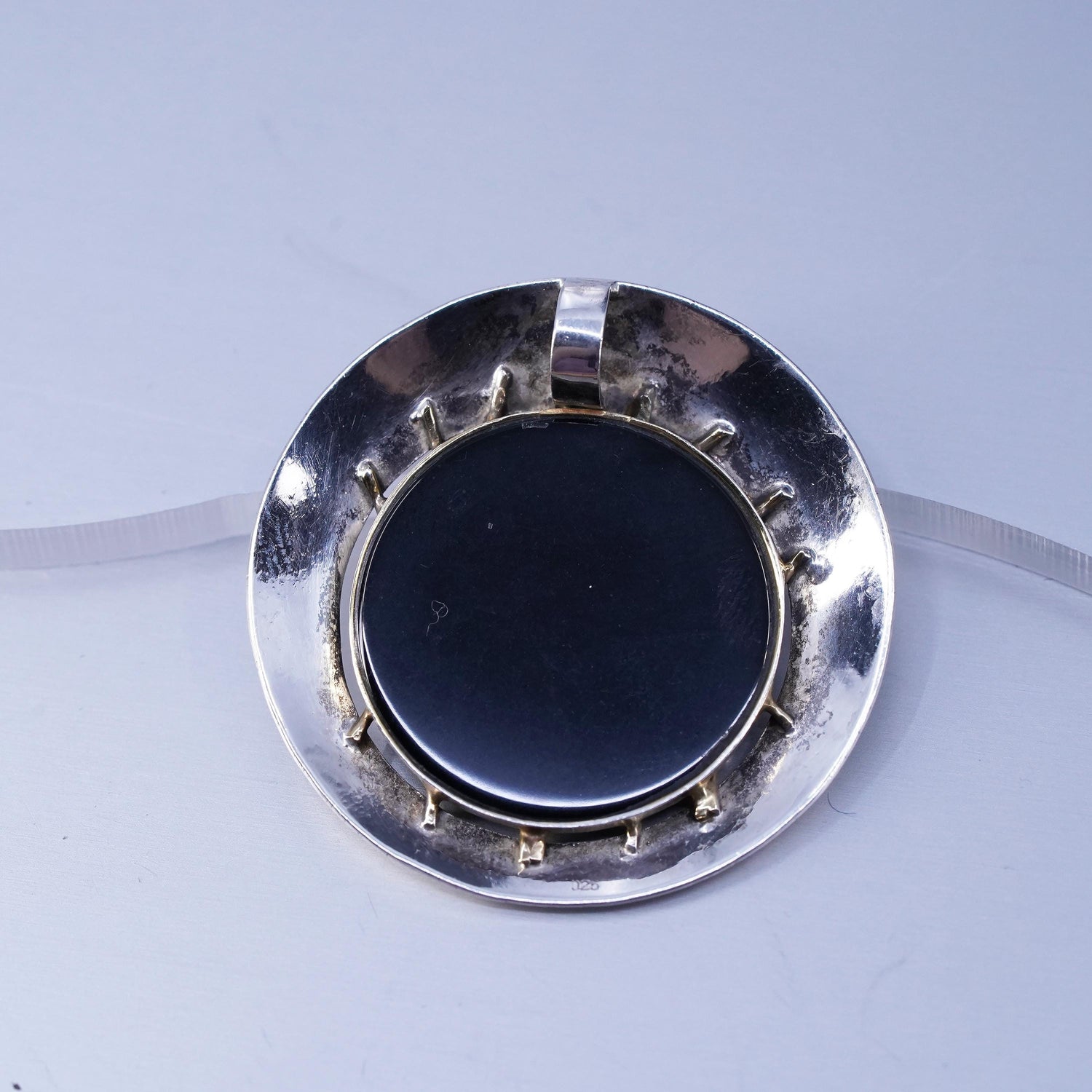 Vintage two tone brase sterling 925 silver handmade circle pendant charm with onyx and beads, stamped 925
