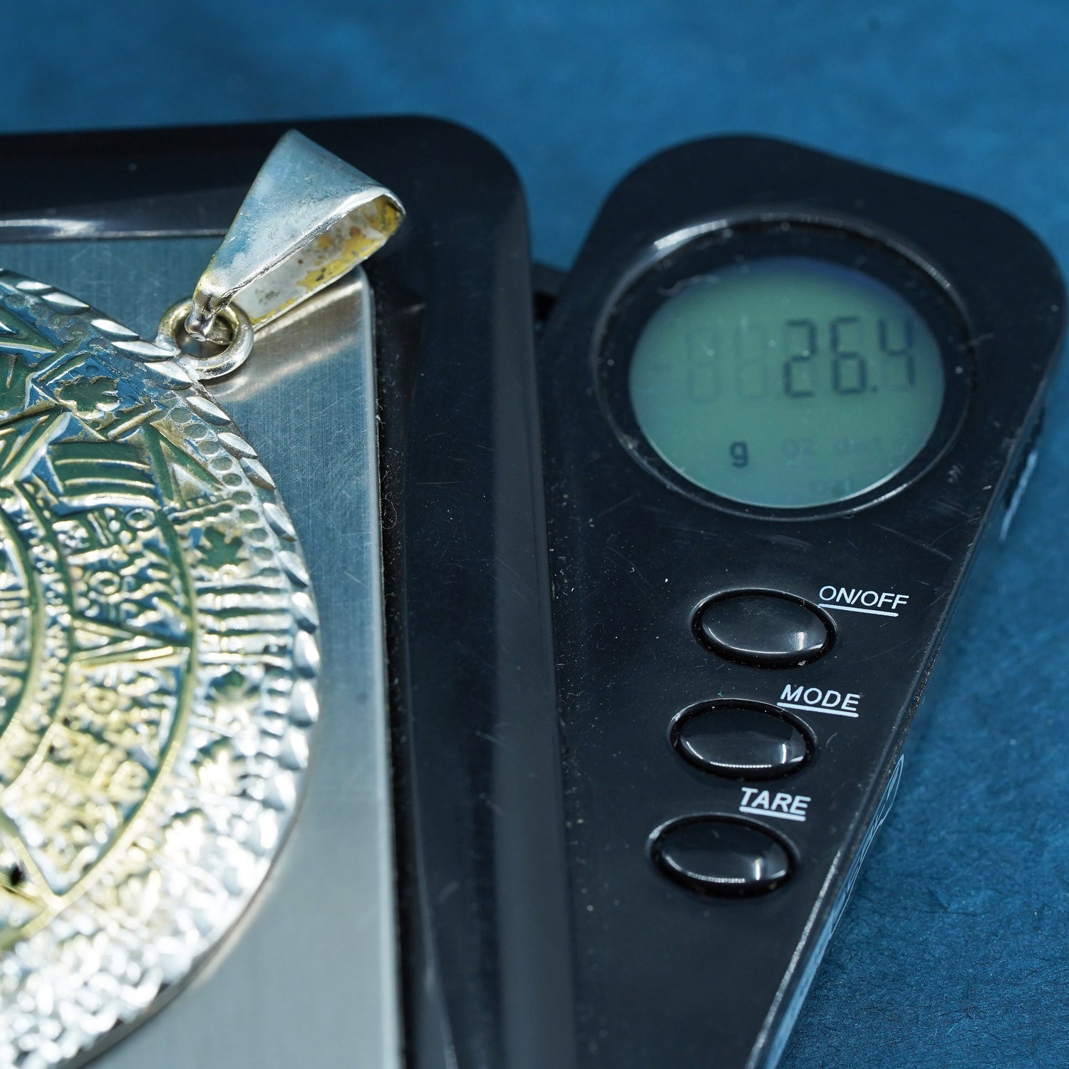Vintage two tone Sterling silver handmade Pendant, huge 925 Mayan calendar, stamped 925