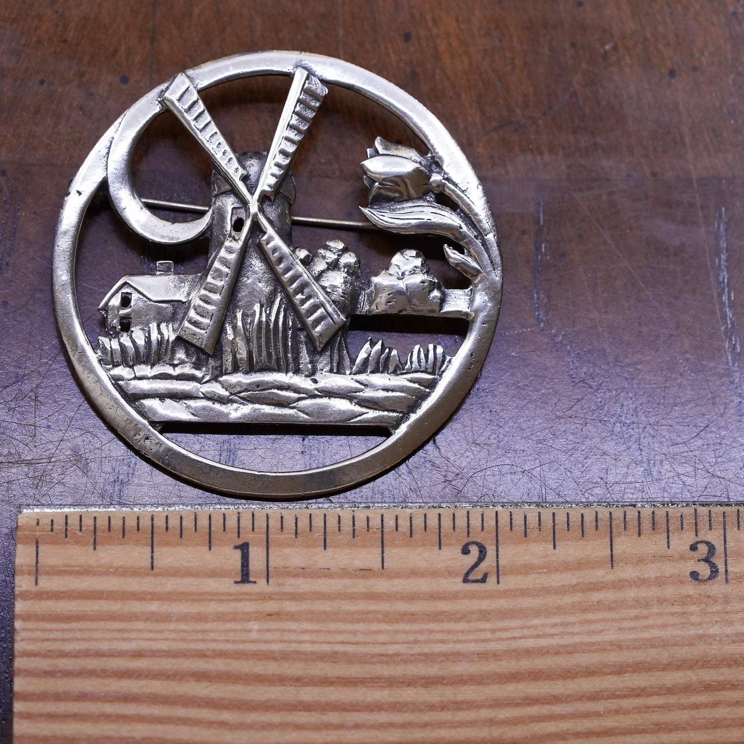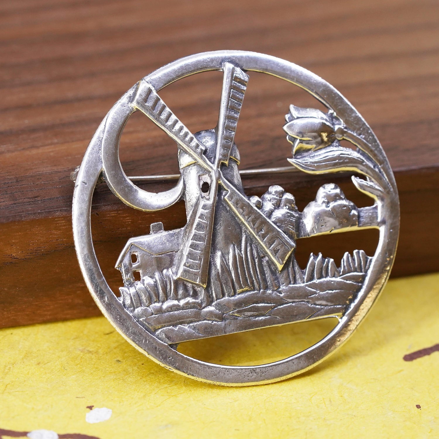 Vintage Holland handmade sterling 925 silver tulip flower windmill circle brooch, stamped sterling