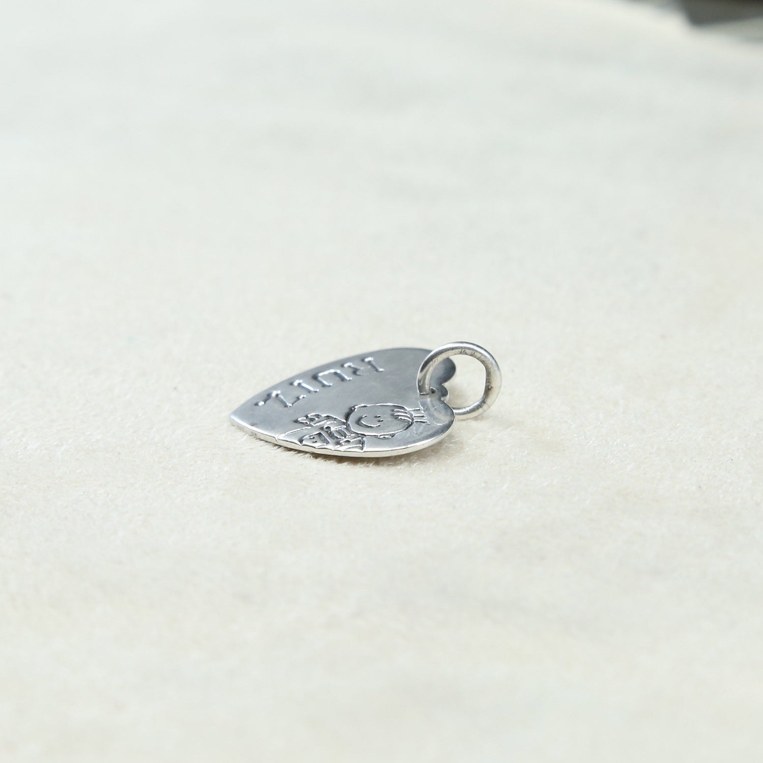Vintage sterling silver handmade pendant, heart shaped tag charm embossed a boy and "Ruiz", Signed Lucy Ann, stamped sterling USA 10.7.98