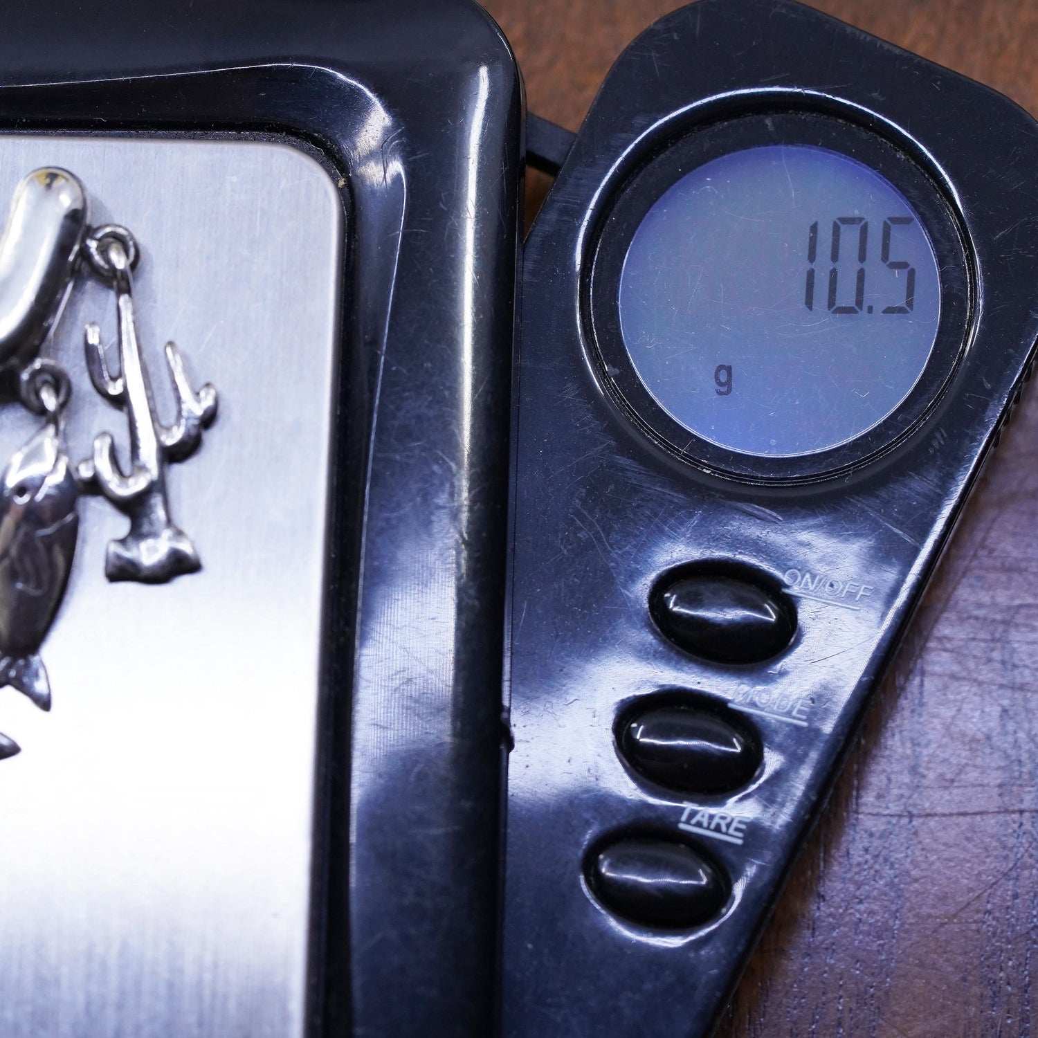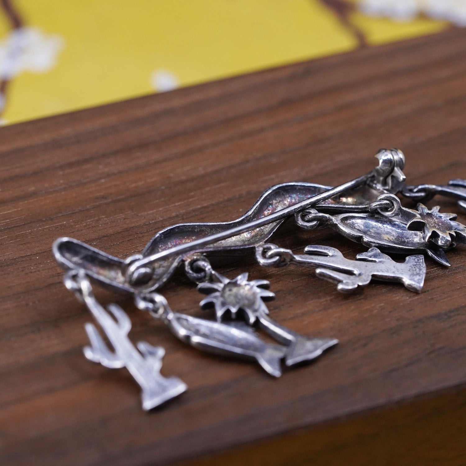 Vintage Mexican sterling 925 silver handmade brooch with cactus palm tree fish charms, stamped 925
