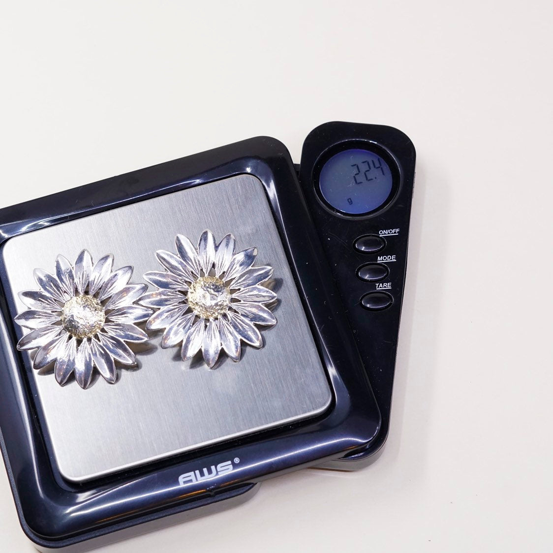 vtg mexico sterling 925 silver handmade earrings, clip on w/ flower sunflower