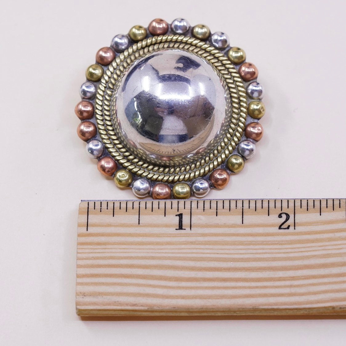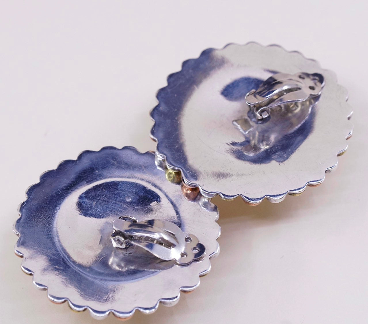 Vintage triple tone Sterling silver clip on earrings, solid 925 silver flower with brass and copper beads, stamped 925 mexico TC-54