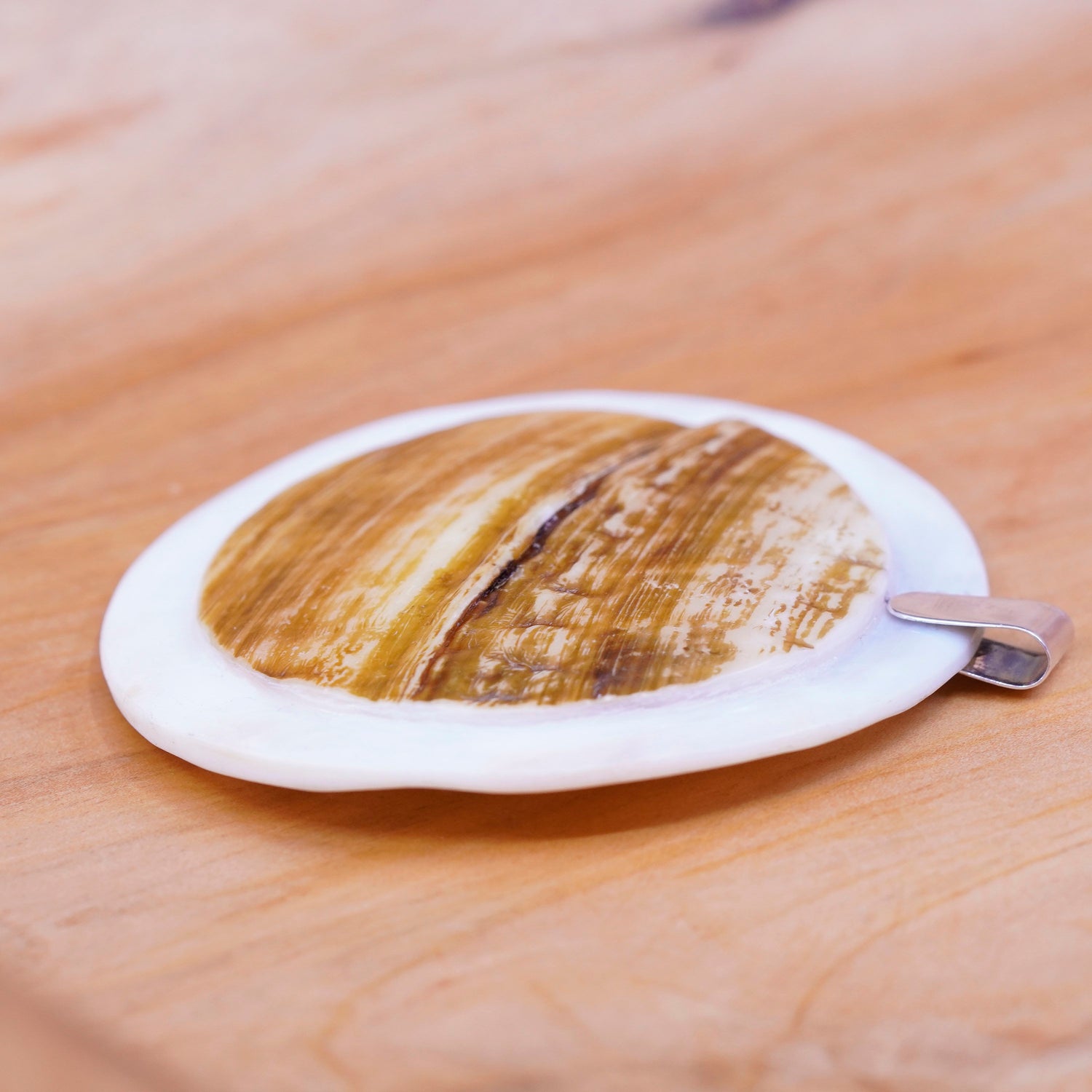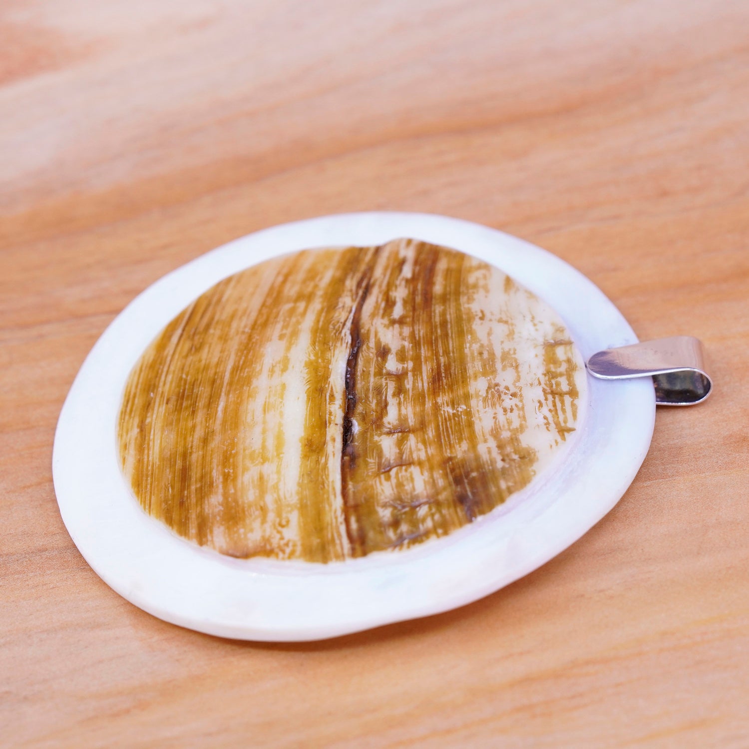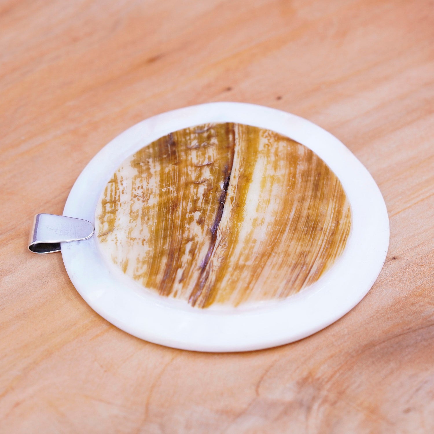 Vintage Sterling 925 silver handmade pendant with huge mother of pearl and wooden texture, silver tested