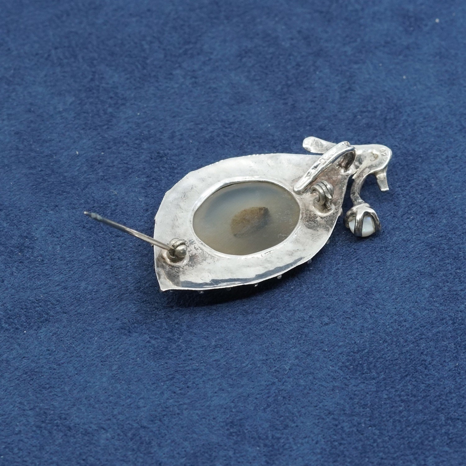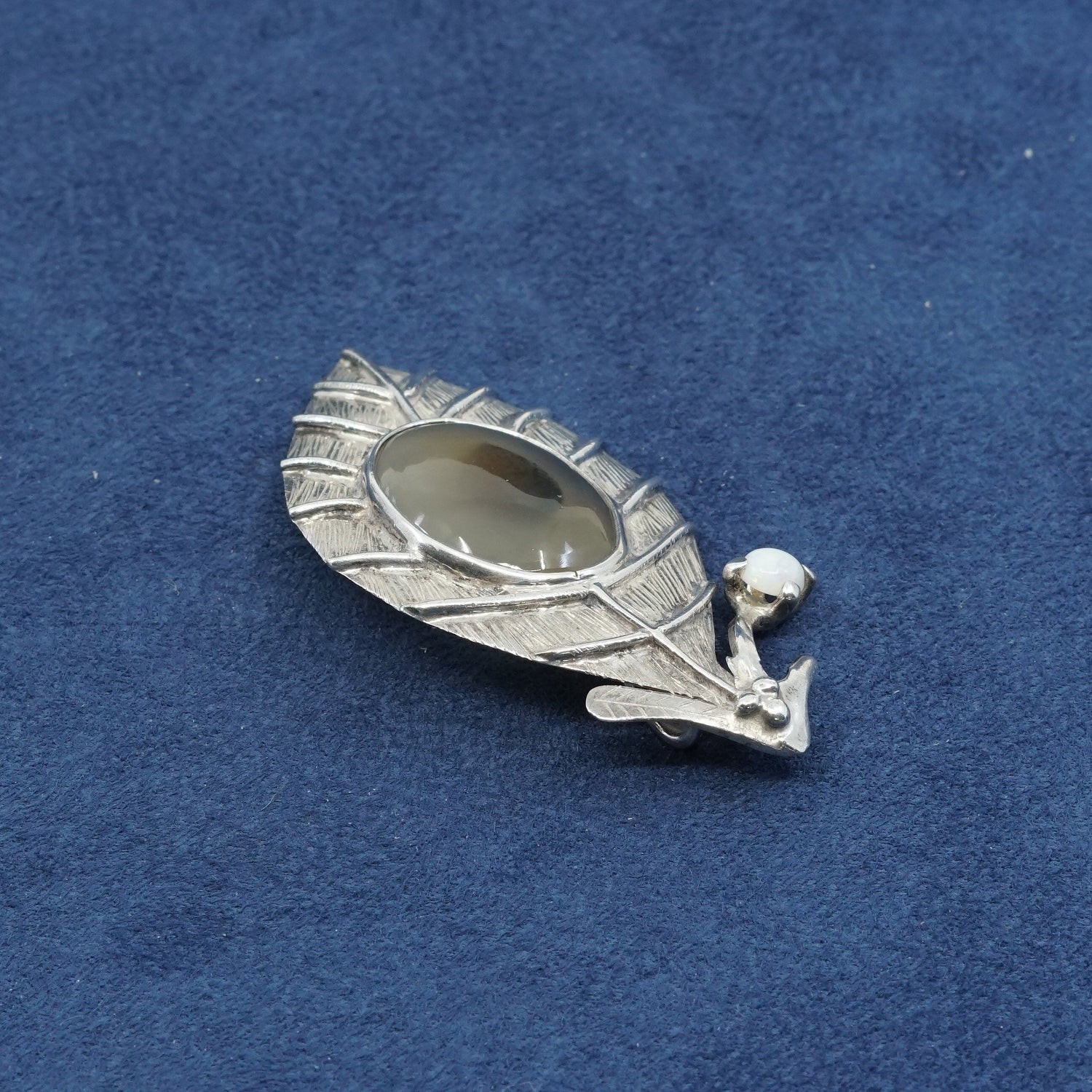 Vintage Sterling silver handmade brooch, solid 925 silver leaf pendant with agate inlay, stamped mexico 925