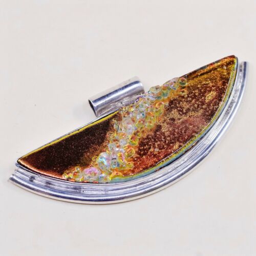Vtg Sterling Silver Handmade Moon Pendant, 925 Silver With Vivic Foiled Glass