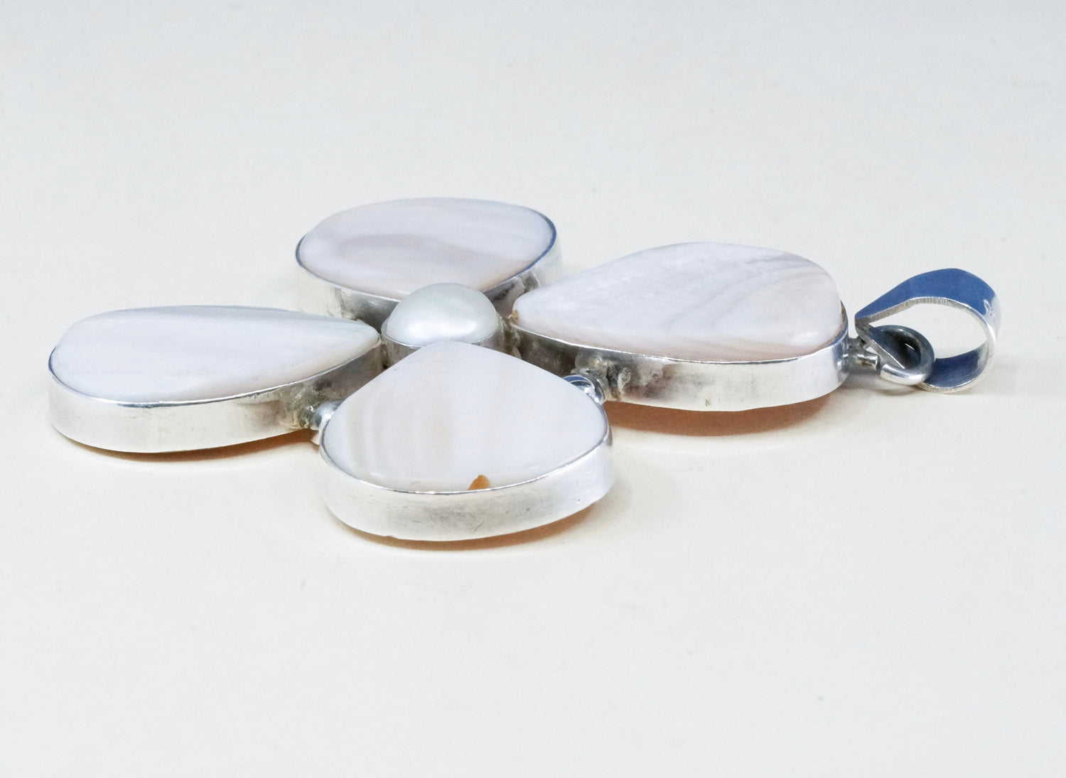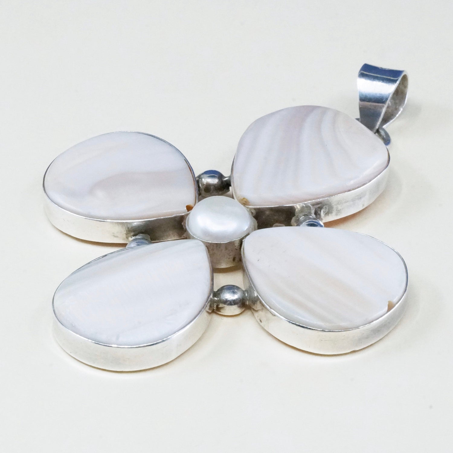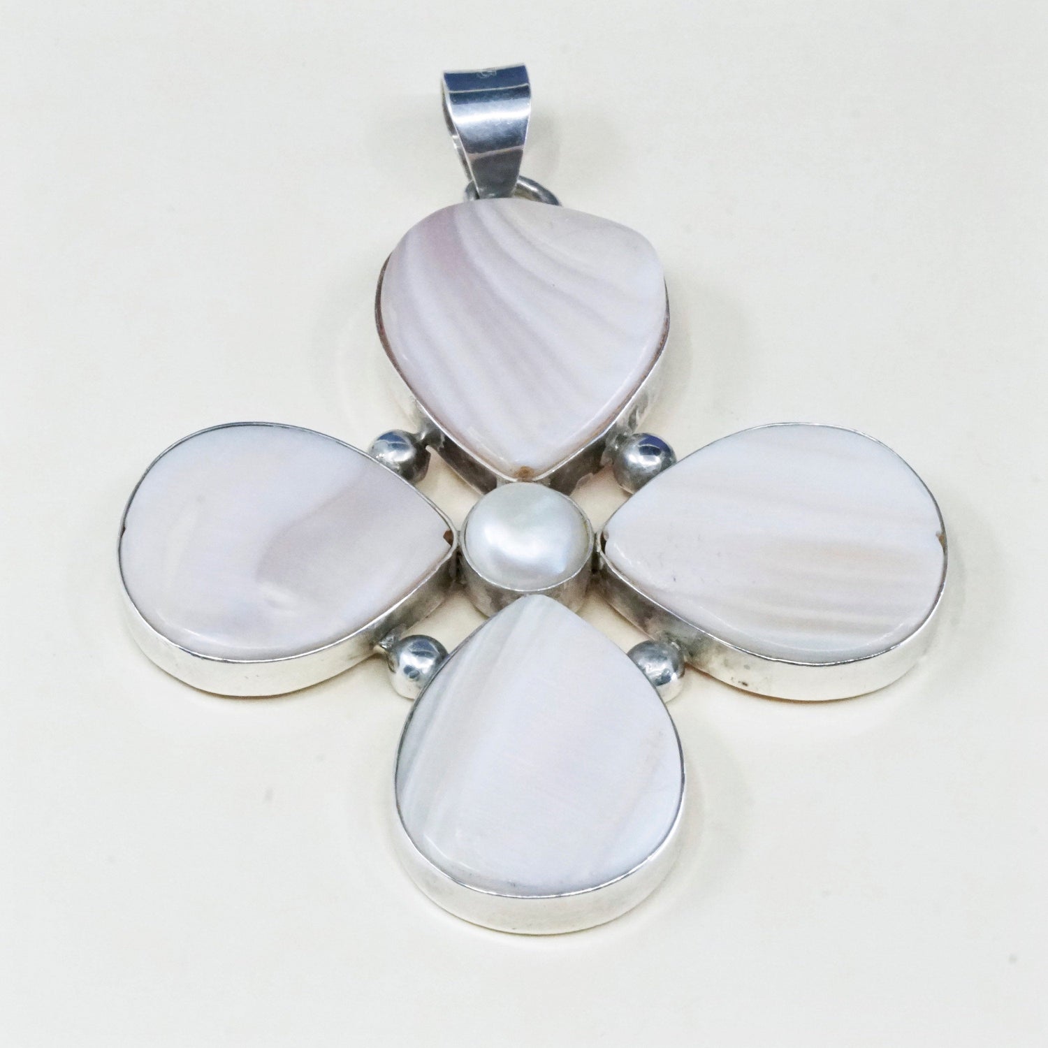 Vintage Sterling silver handmade pendant, 925 lucky clover with pink mother of pearl leaves and pearl center, silver tested