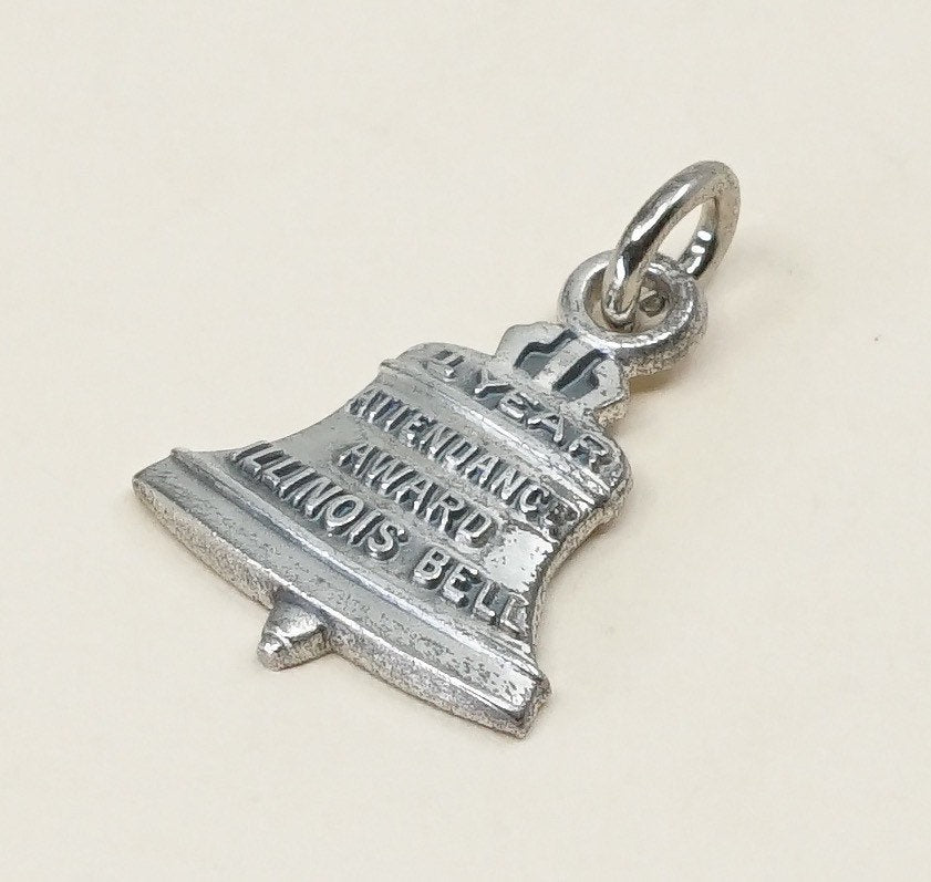 Vintage sterling silver handmade pendant, oxidized 925 Mexico silver bell "1 year attendance award Illinois bell" charm, Stamped sterling