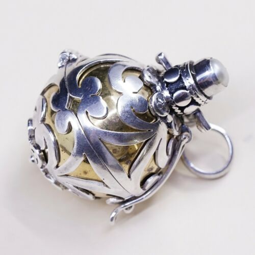 Vtg Two Tone Bali Handmade Sterling 935 Silver Pendant W/ Brass Chime Ball